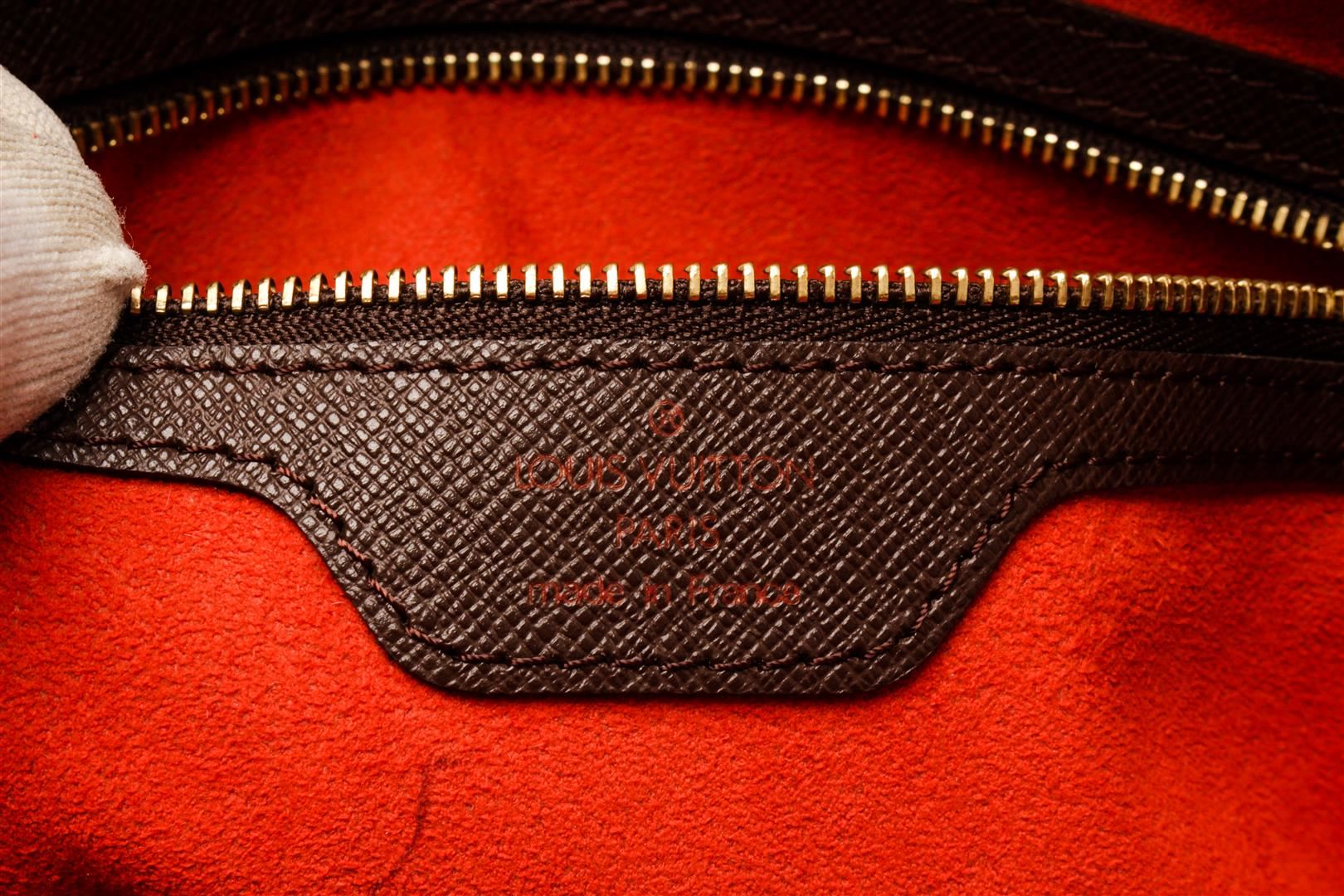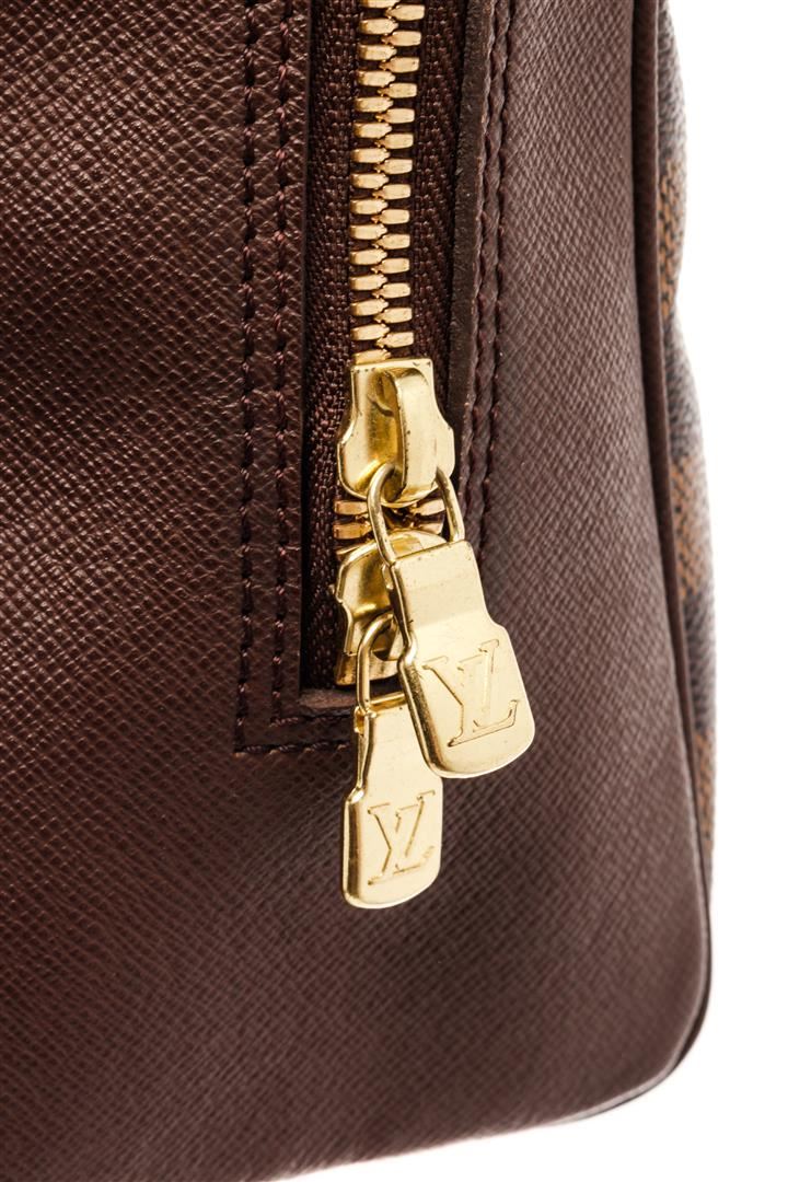 Louis Vuitton Brown Canvas Damier Ebene Brera Tote Bag. All available information is listed in the description and shown in the photos. Louis Vuitton Brown Canvas Damier Ebene Brera Tote Bag with brown coated canvas, damier ebene pattern, brass hardware, dual rolled handles, alcantara lining & single interior pocket, zipper closure at top. Height: 8.5" Width: 9.5" Depth: 4.25", Handle Drop: 5" / 21.59 x 24.13 x 10.79 Cm