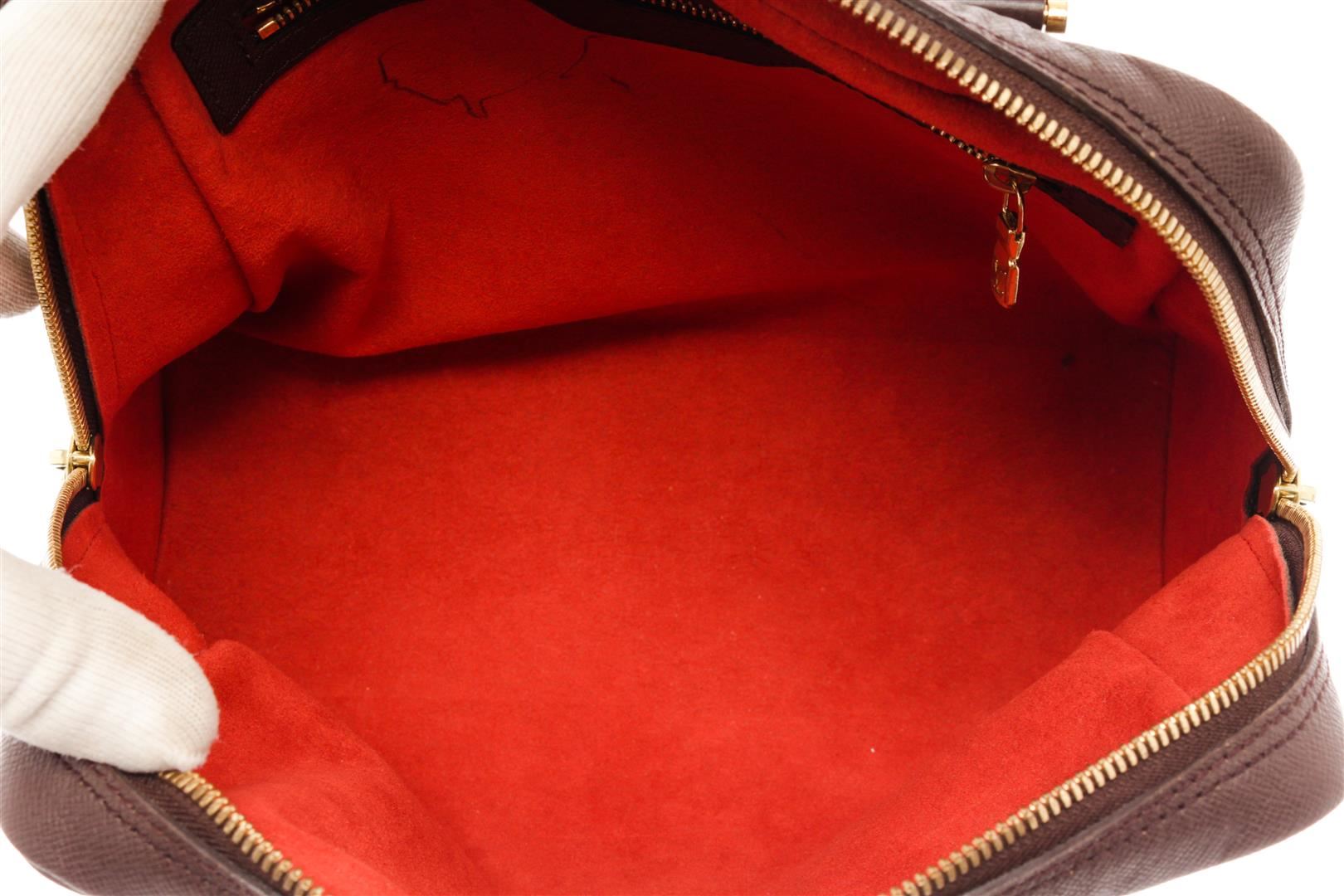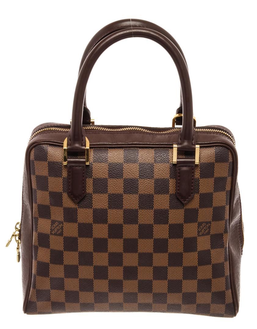 Louis Vuitton Brown Canvas Damier Ebene Brera Tote Bag. All available information is listed in the description and shown in the photos. Louis Vuitton Brown Canvas Damier Ebene Brera Tote Bag with brown coated canvas, damier ebene pattern, brass hardware, dual rolled handles, alcantara lining & single interior pocket, zipper closure at top. Height: 8.5" Width: 9.5" Depth: 4.25", Handle Drop: 5" / 21.59 x 24.13 x 10.79 Cm