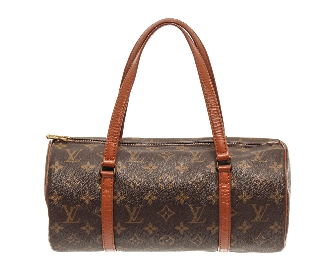 One Louis Vuitton Brown Canvas Papillon 30 Shoulder Bag. Item is sold AS-IS. All available information is listed in the description and shown in the photo. louis vuitton brown canvas papillon 30 shoulder bag with material monogram canvas, gold-tone hardware, brown vintage leather trim, dual top handles, brown leather interior lining, and zipper closure at top.