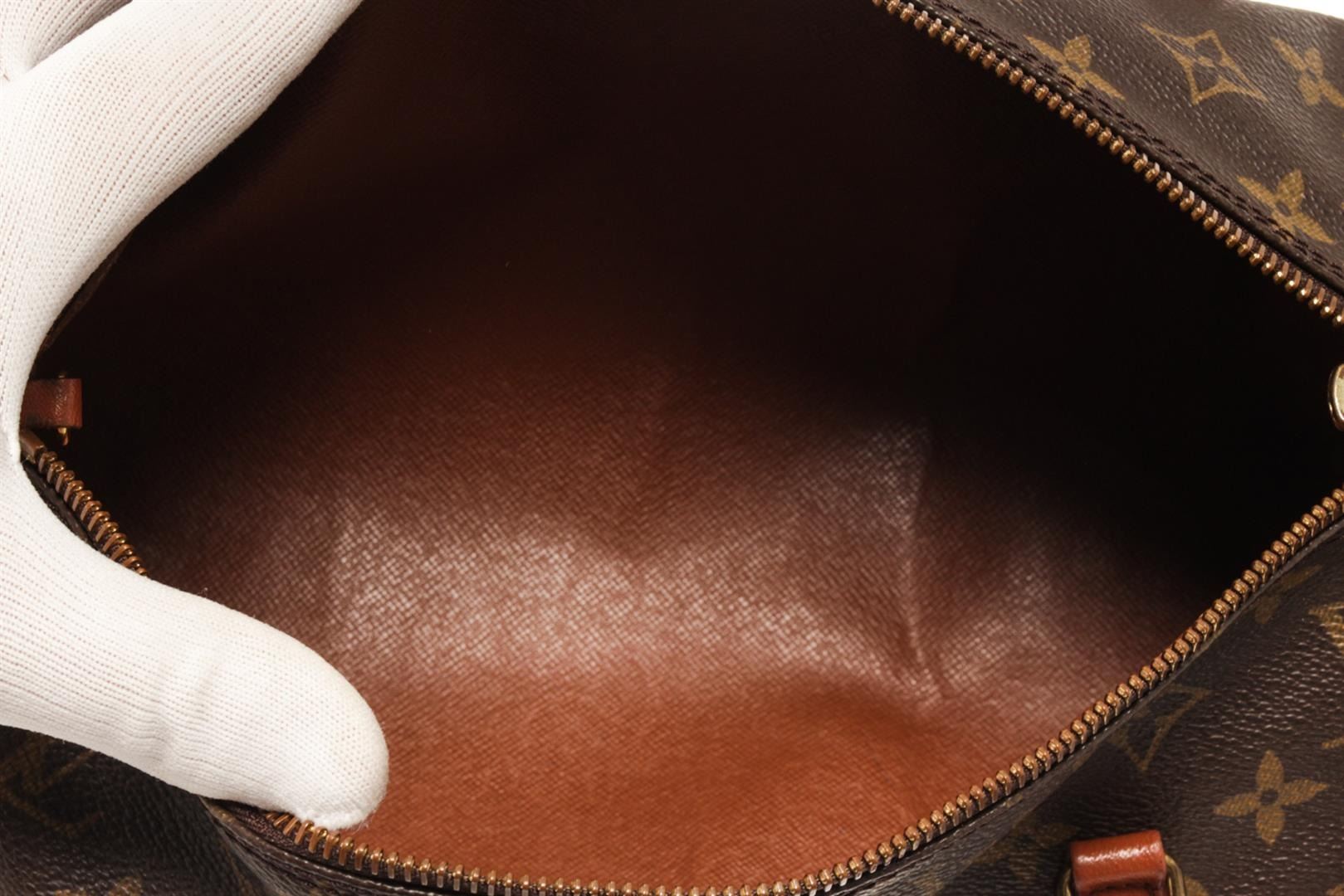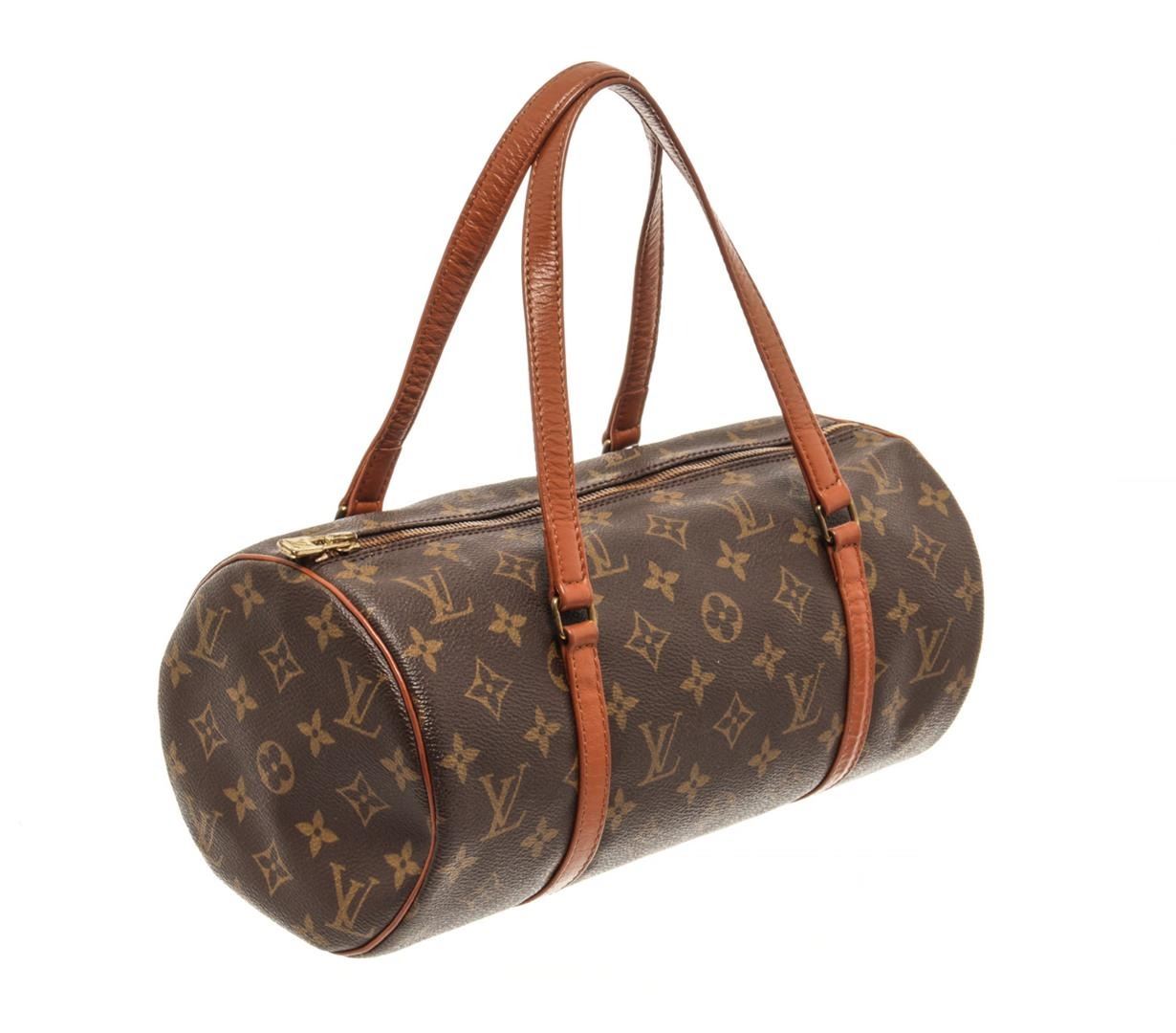 One Louis Vuitton Brown Canvas Papillon 30 Shoulder Bag. Item is sold AS-IS. All available information is listed in the description and shown in the photo. louis vuitton brown canvas papillon 30 shoulder bag with material monogram canvas, gold-tone hardware, brown vintage leather trim, dual top handles, brown leather interior lining, and zipper closure at top.