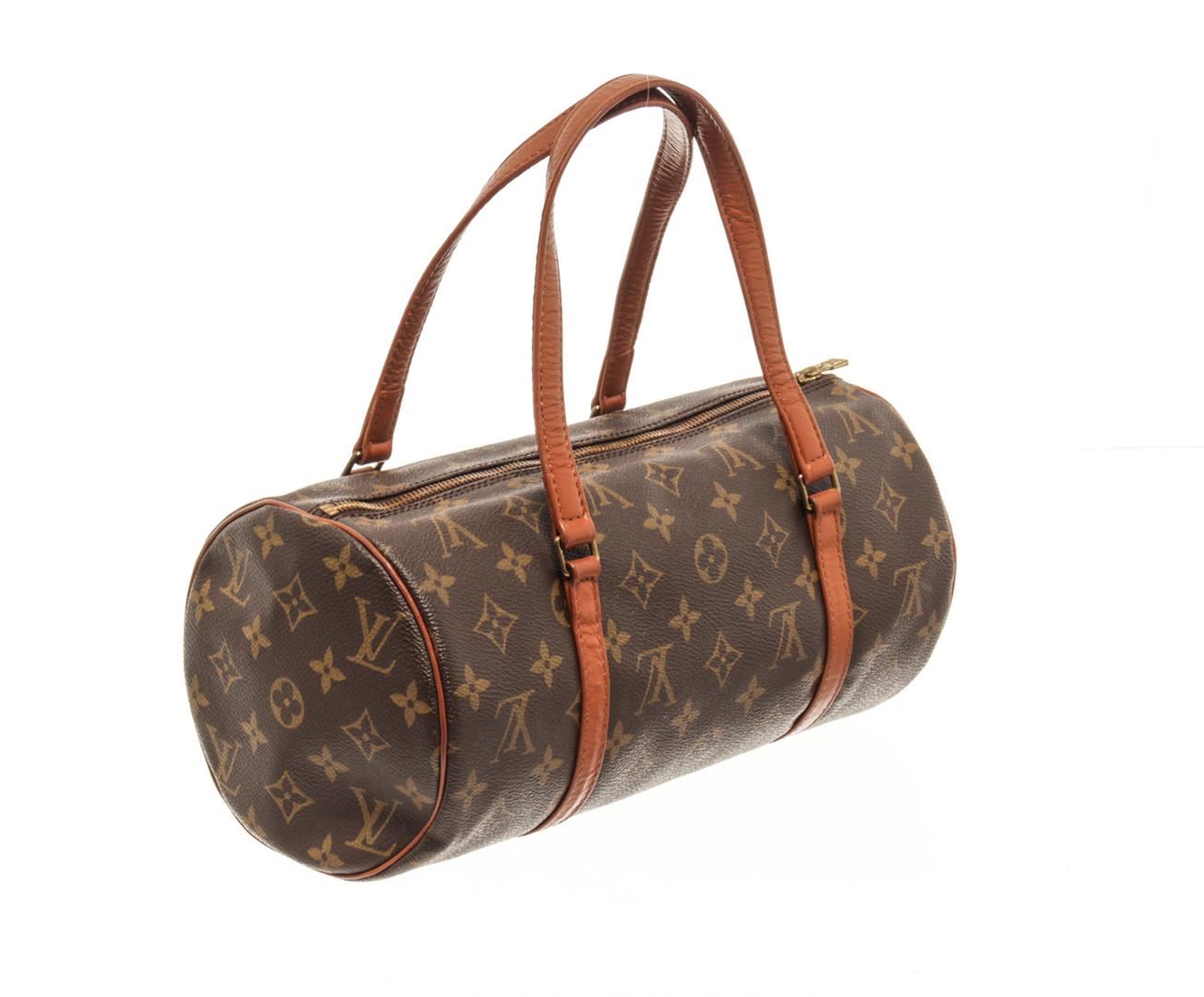 One Louis Vuitton Brown Canvas Papillon 30 Shoulder Bag. Item is sold AS-IS. All available information is listed in the description and shown in the photo. louis vuitton brown canvas papillon 30 shoulder bag with material monogram canvas, gold-tone hardware, brown vintage leather trim, dual top handles, brown leather interior lining, and zipper closure at top.