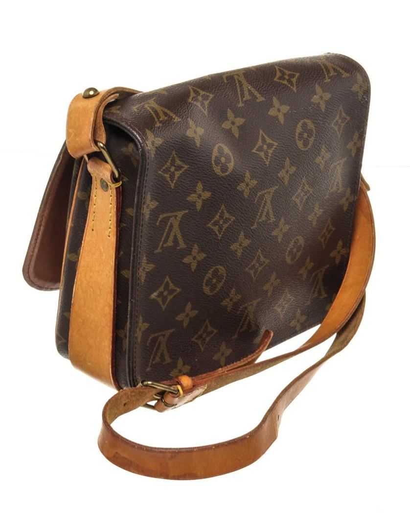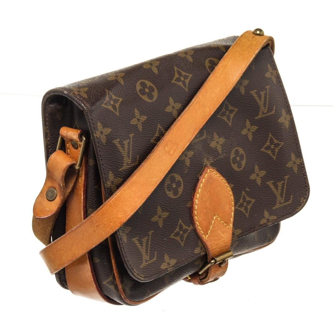 Louis Vuitton Brown Cartouchiere MM Crossbody Bags with monogram canvas, gold-tone hardware, trim tan vachetta leather, interior compartments pocket, shoulder strap and flap closure.