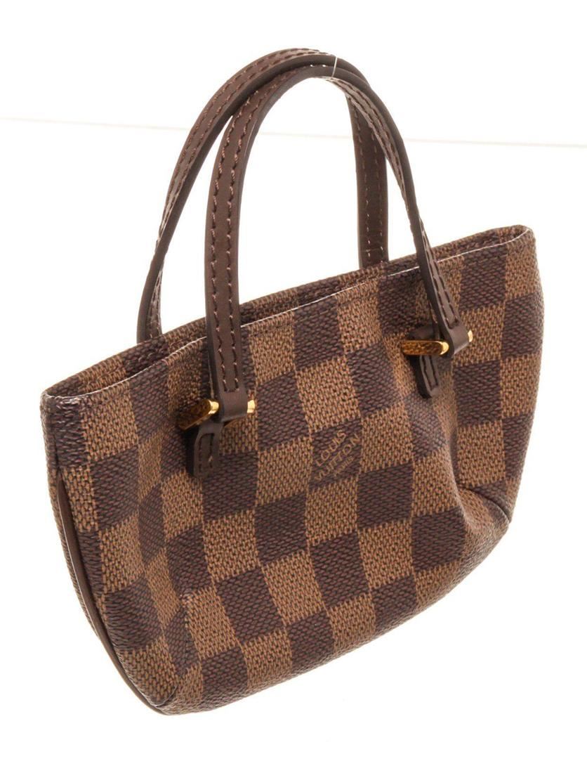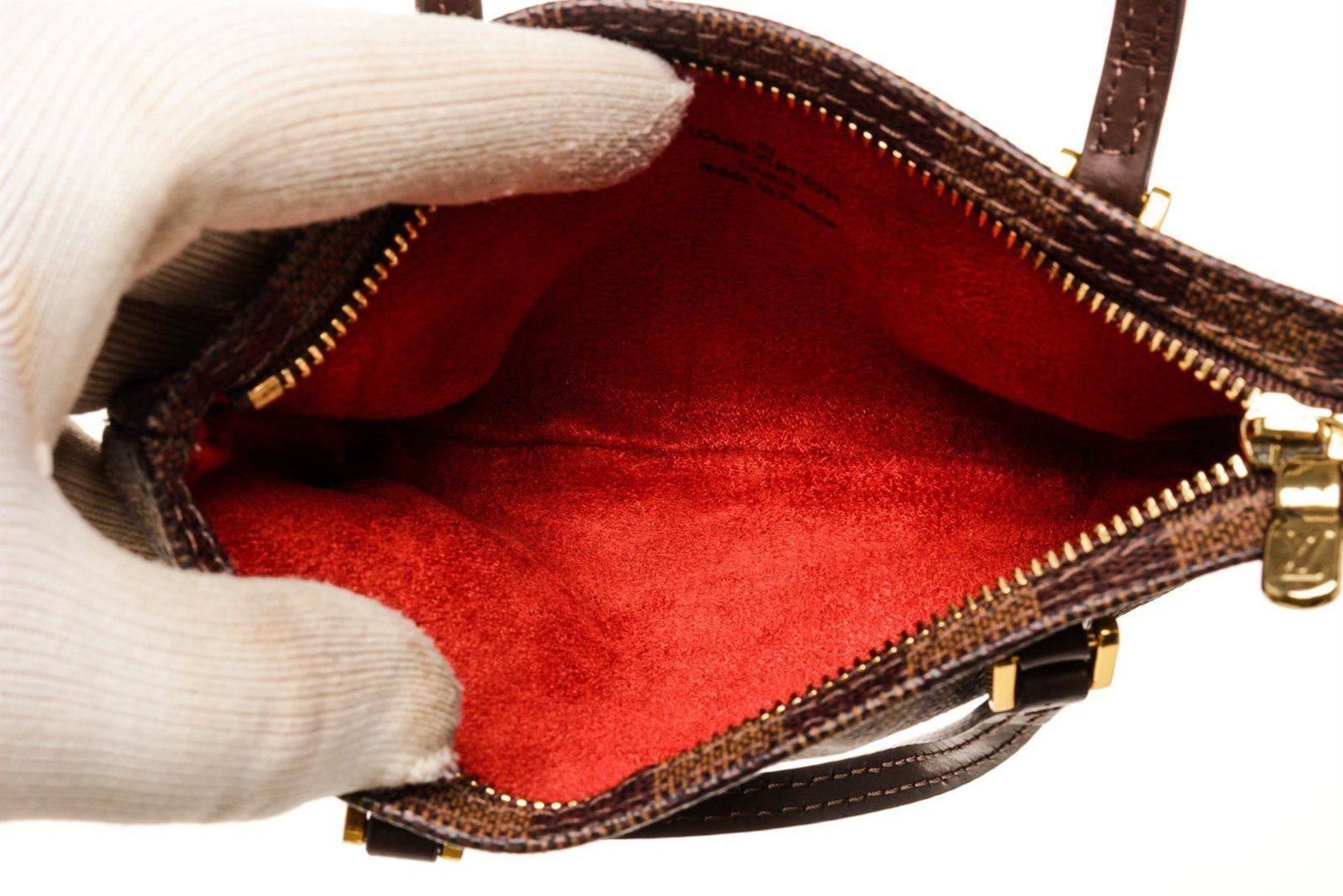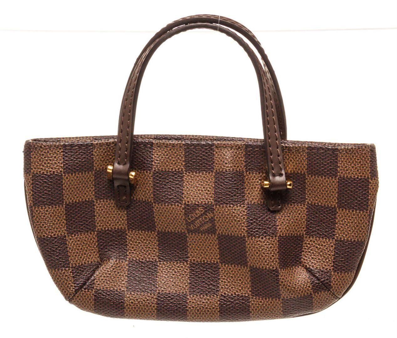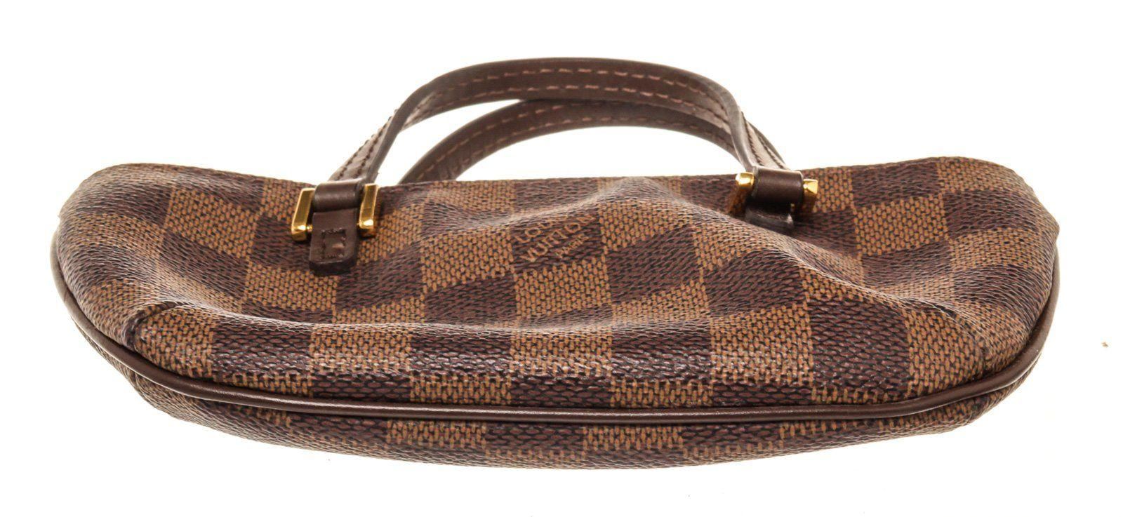 Louis Vuitton Brown Damier Canvas Manosque Pouch Clutch Bag with Damier canvas, gold-tone hardware, tan vachetta leather, dual top handle and zipper closure.