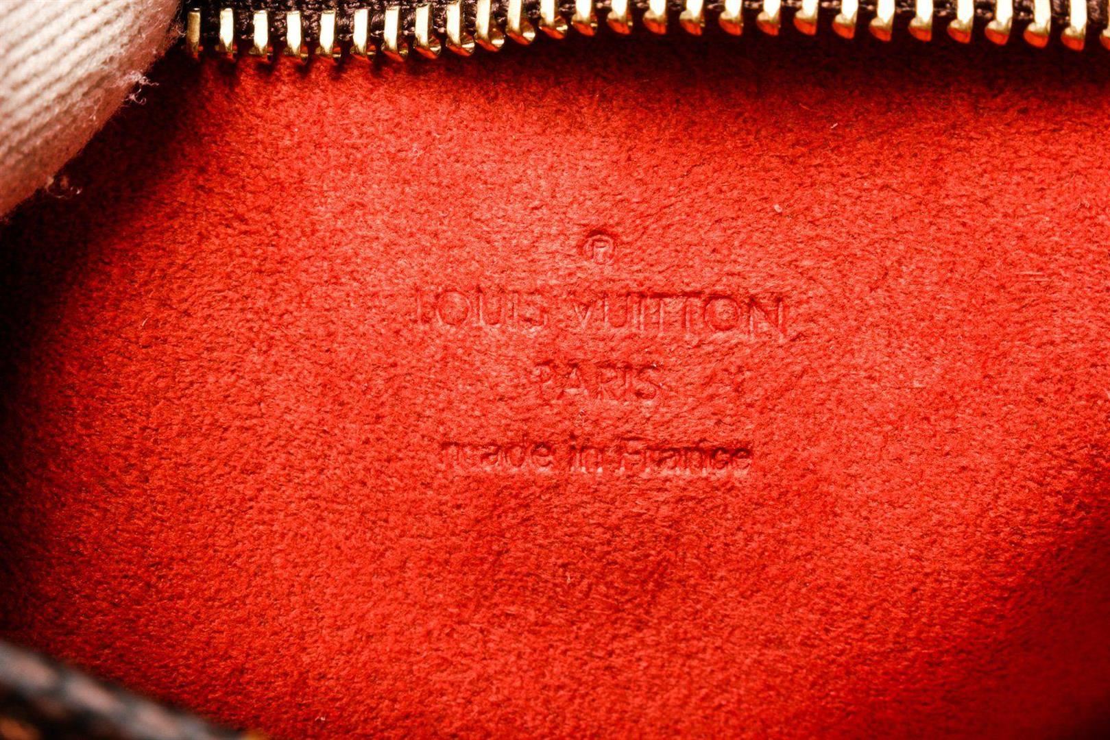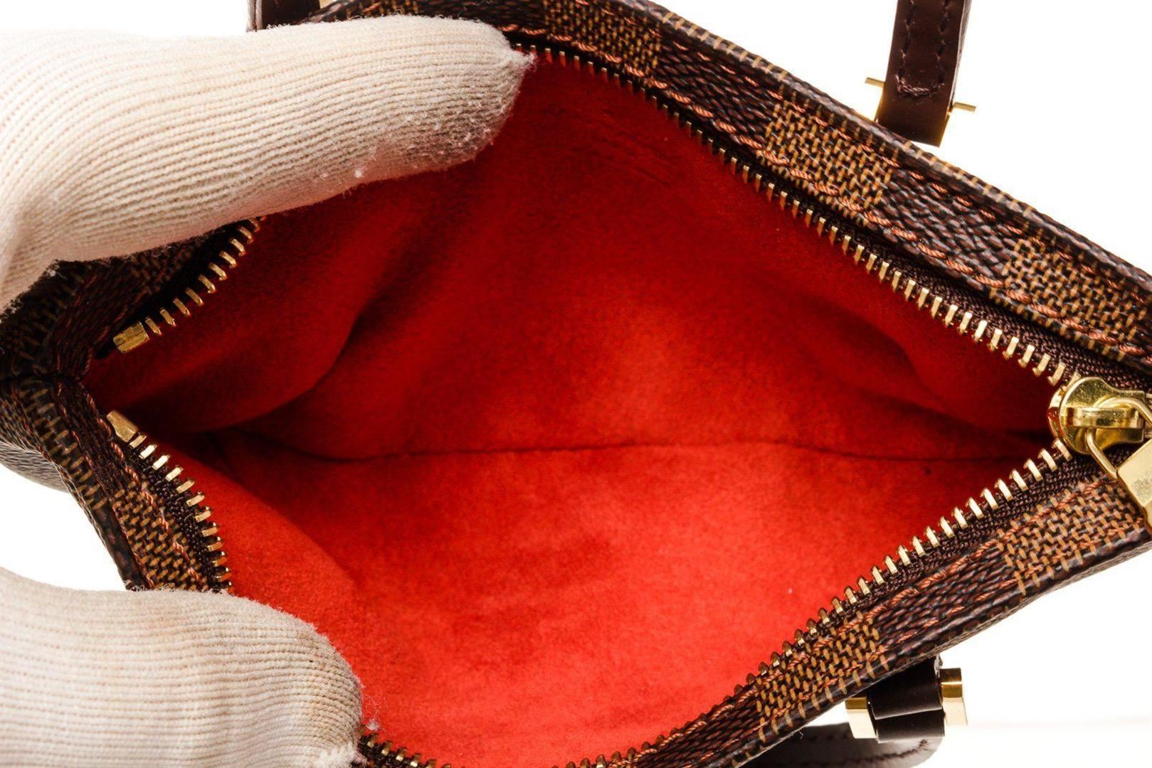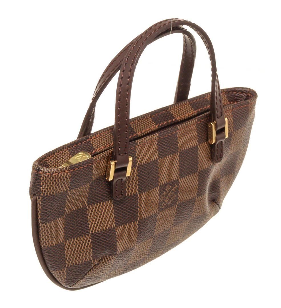 Louis Vuitton Brown Damier Canvas Manosque Pouch Clutch Bag with Damier canvas, gold-tone hardware, tan vachetta leather, dual top handle and zipper closure.