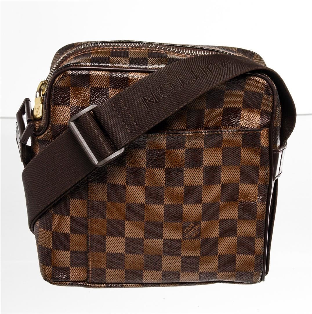 Louis Vuitton Brown Damier Canvas Olav PM Shoulder Bag with damier canvas gold-tone hardware, trim tan vachetta leather, interior slip pocket, canvas lining, shoulder strap, and zipper closure.