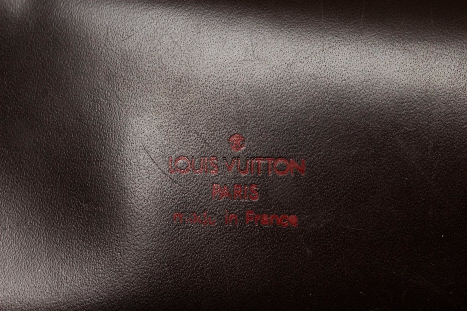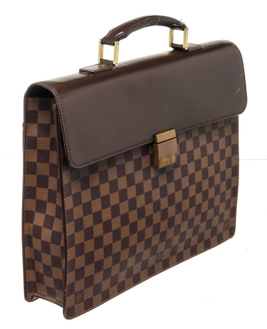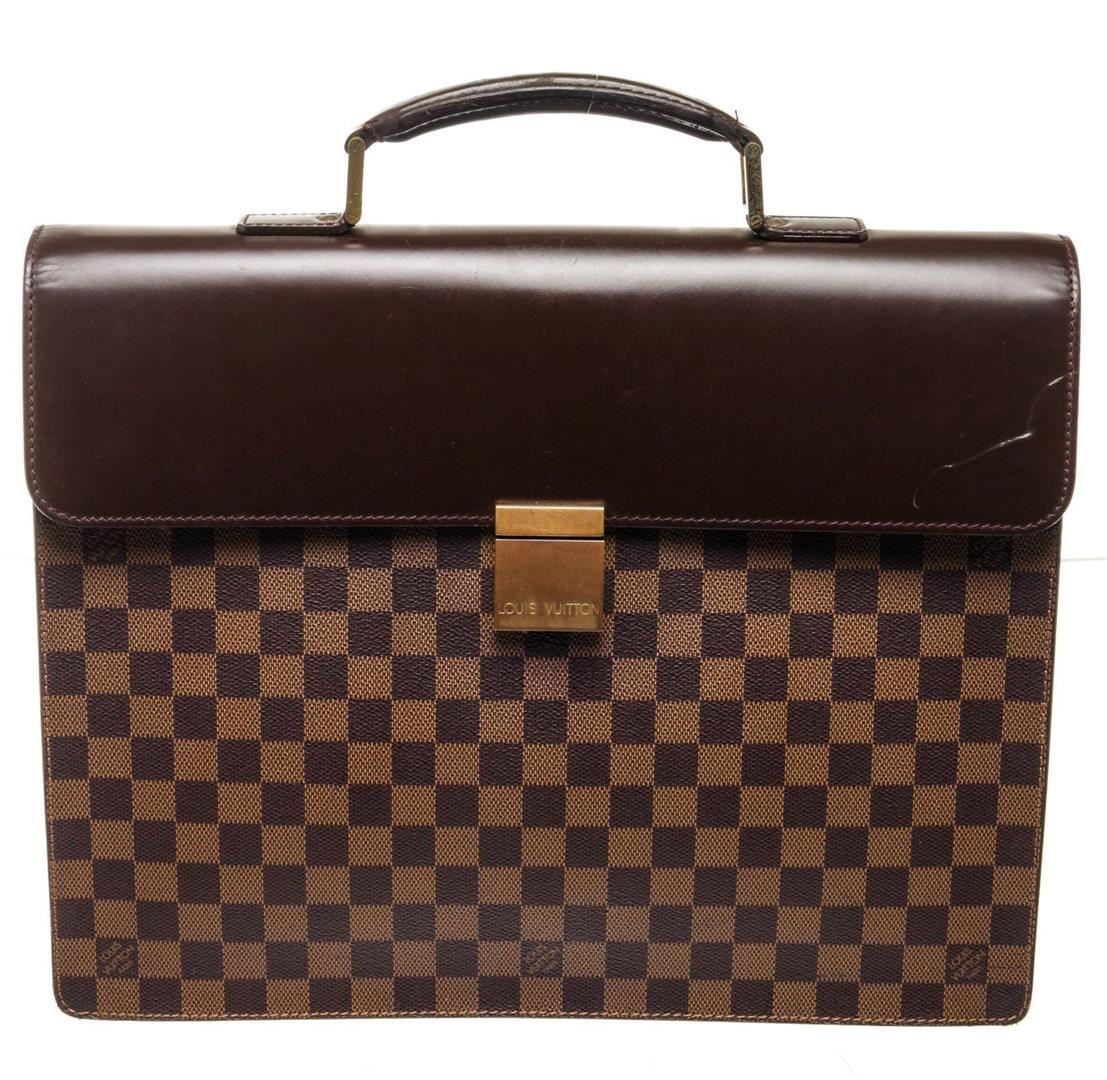 Louis Vuitton Brown Damier Ebene Altona PM Briefcases Bag with damier ebene, gold-tone hardware, damier ebene material, tan vachetta leather trim, top handle, leather shoulder strap, and zipper closure.