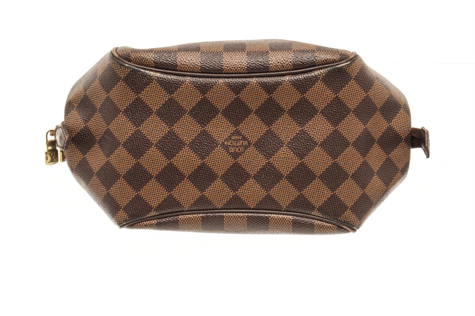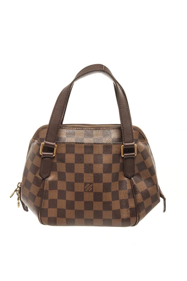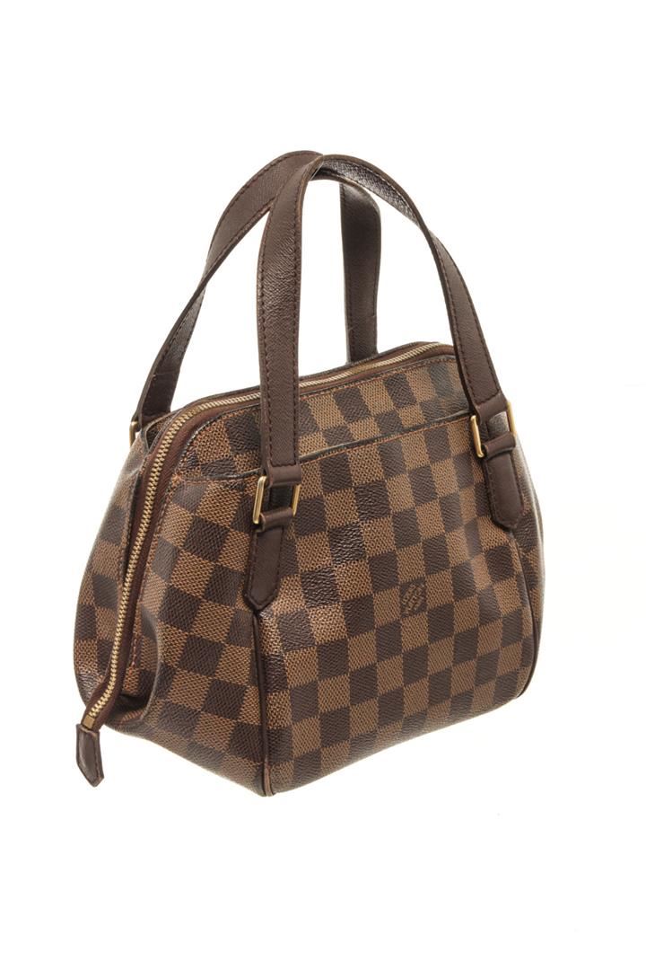 One Louis Vuitton Brown Damier Ebene Canvas Belem Pm Top-Handle Bag. Item is sold AS-IS. All available information is listed in the description and shown in the photo. louis vuitton brown damier ebene canvas belem pm top-handle bag with gold-tone hardware, brown, leather trim, two rounded top handles, two-way zip fastening, main compartment slip pocket to the front slip pocket to the rear, zip closure. Depth 5.5 in, Handle 3.5 in, Height 7.1 in, Width 9.8 in / Depth 14 cm, Handle 9 cm, Height 18 cm, Width 25 cm