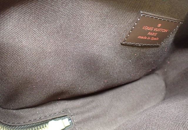 One Louis Vuitton Brown Damier Ebene Geronimos Waist Bag. Item is sold AS-IS. All available information is listed in the description and shown in the photo. Brown Damier Ebene coated canvas Louis Vuitton Geronimos waist bag with gold-tone hardware, single adjustable waist strap with buckle closure, single pocket at exterior with snap closure, brown canvas lining and zip around closure..