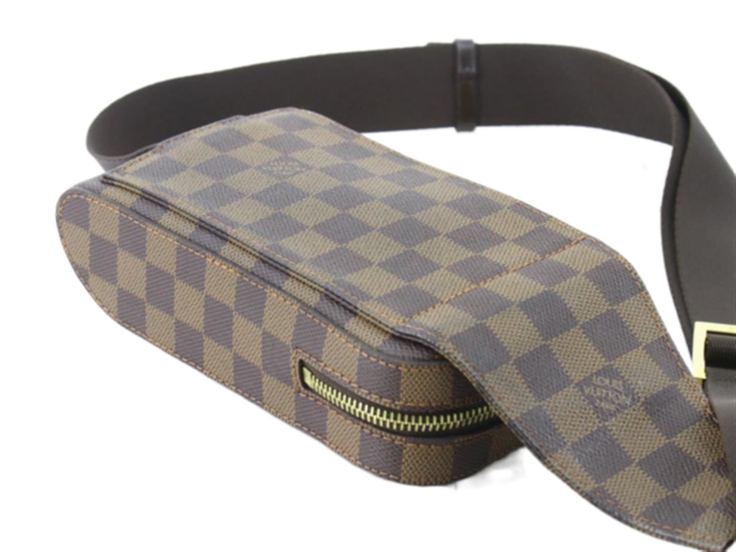 One Louis Vuitton Brown Damier Ebene Geronimos Waist Bag. Item is sold AS-IS. All available information is listed in the description and shown in the photo. Brown Damier Ebene coated canvas Louis Vuitton Geronimos waist bag with gold-tone hardware, single adjustable waist strap with buckle closure, single pocket at exterior with snap closure, brown canvas lining and zip around closure..