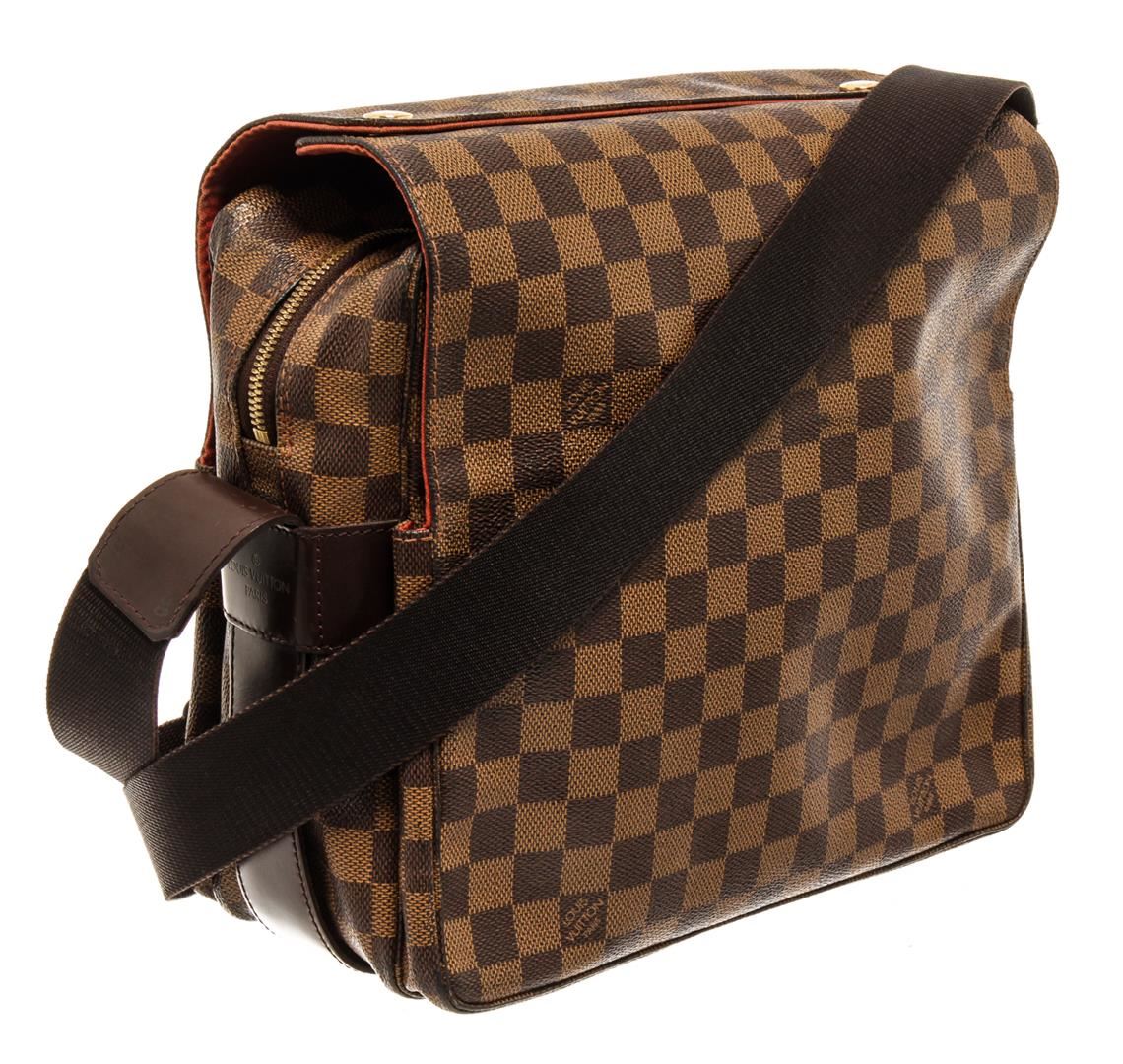 Louis Vuitton Brown Damier Ebene Naviglio Messenger Bag. All available information is listed in the description and shown in the photos. Louis Vuitton Brown Damier Ebene Naviglio Messenger Bag with damier ebene pattern, gold-tone hardware, single adjustable shoulder strap, grosgrain lining & single interior pocket, snap closure at top Height: 30" Width: 13.5" Depth: 5" Shoulder Strap Drop: 20"