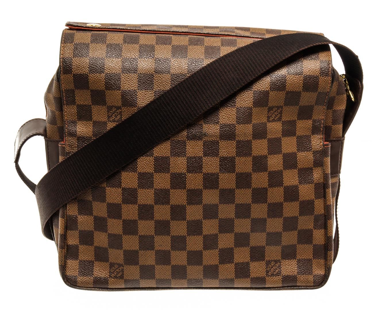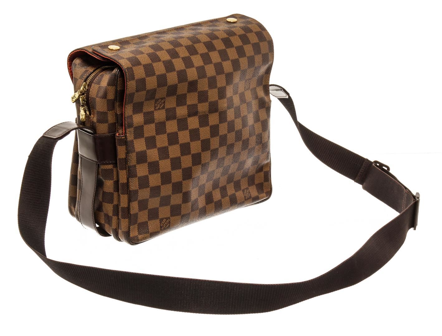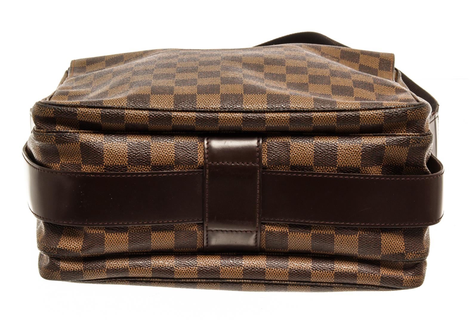 Louis Vuitton Brown Damier Ebene Naviglio Messenger Bag. All available information is listed in the description and shown in the photos. Louis Vuitton Brown Damier Ebene Naviglio Messenger Bag with damier ebene pattern, gold-tone hardware, single adjustable shoulder strap, grosgrain lining & single interior pocket, snap closure at top Height: 30" Width: 13.5" Depth: 5" Shoulder Strap Drop: 20"
