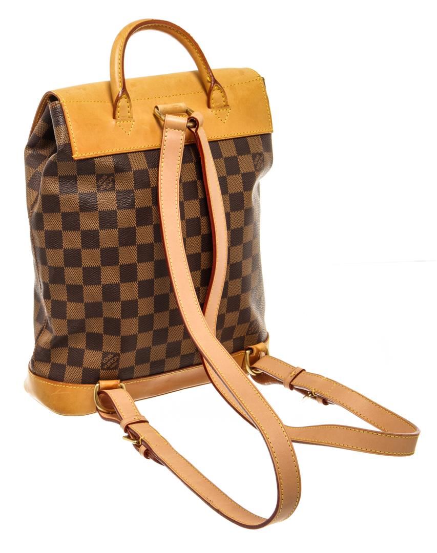 One Louis Vuitton Brown Damier Ebene Soho Backpack. Item is sold AS-IS. All available information is listed in the description and shown in the photo. Louis Vuitton Brown Damier Ebene Soho Backpack with top handle, gold hardware, brown fabric lining, interior pocket, buckle closure.