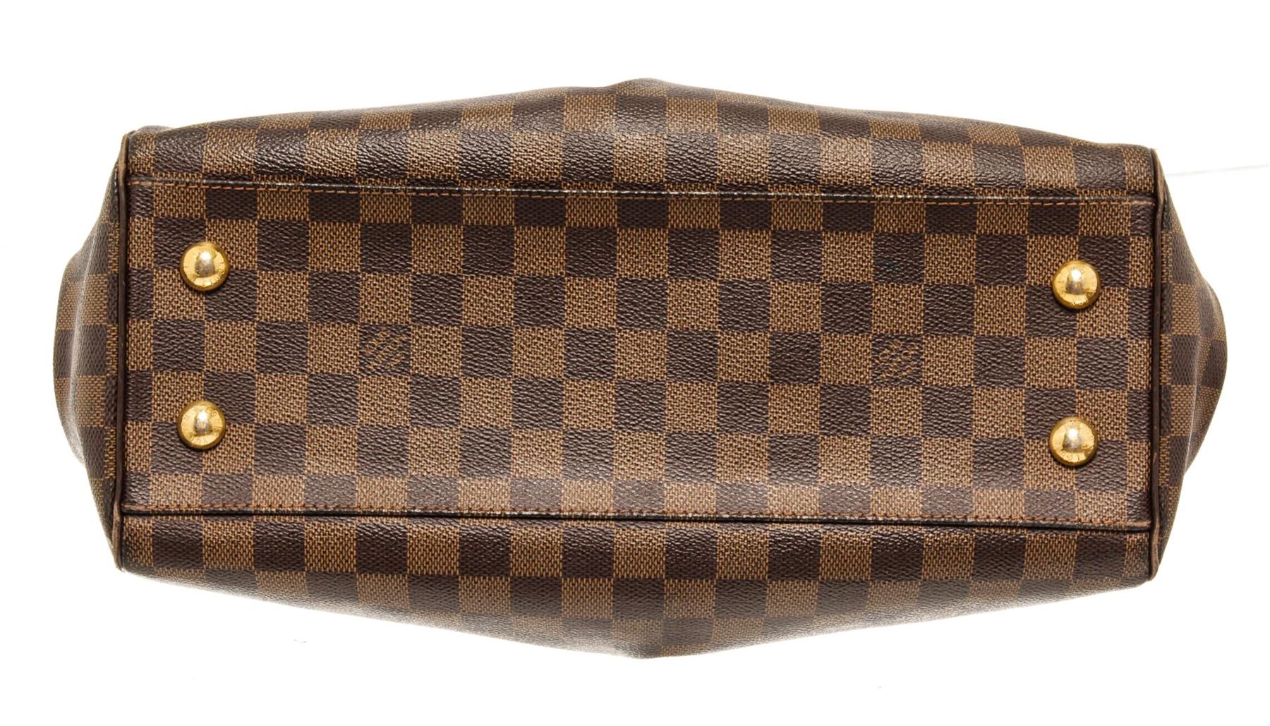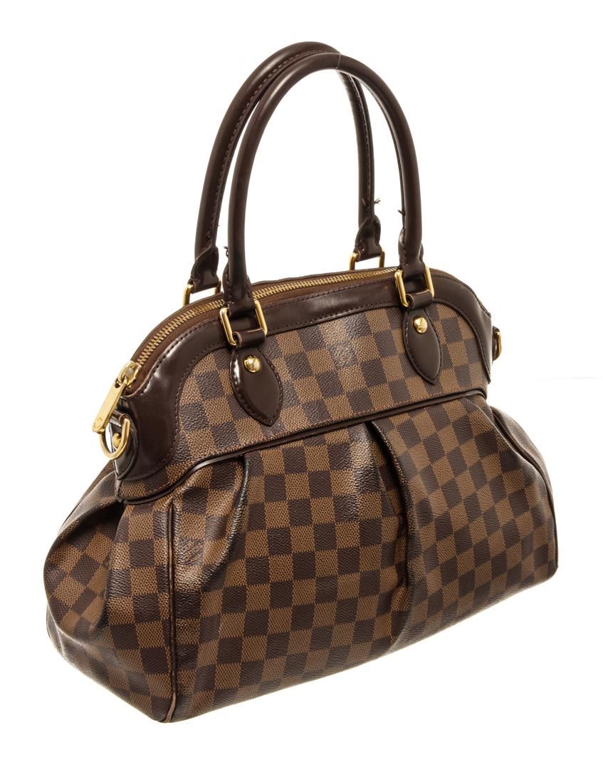 One Louis Vuitton Brown Damier Ebene Trevi PM Shoulder Bag. Item is sold AS-IS. All available information is listed in the description and shown in the photo. Louis Vuitton Brown Damier Ebene Trevi PM Shoulder Bag with damier ebene pattern, brass hardware, leather trim, rolled handles & single adjustable shoulder strap, alcantara lining & dual interior pockets, zip closure at top, protective feet at base Height: 10" Width: 14" Depth: 5.5", Handle Drop: 5.5" / 25.4 x 35.5 x 13.9 Cm