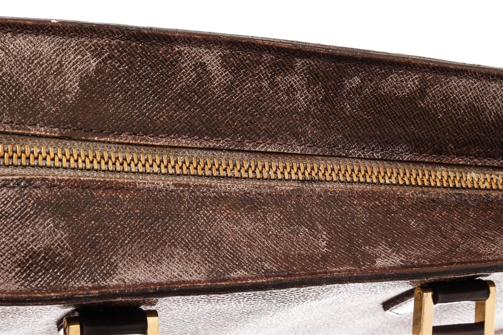 Louis Vuitton Brown Damier Ebene Venice Sac Plat Bag. All available information is listed in the description and shown in the photos. Louis Vuitton Brown Damier Ebene Venice Sac Plat Bag with the venice sac plat features a damier canvas body, damier ebene pattern, leather trim embellishment, rolled leather handles, a top zip closure, and alcantara lining & single interior pocket. 11.2" L x 11" W x 3.1" D, Drop: 3.7", 28.44 x 27.94 x 7.87 Cm