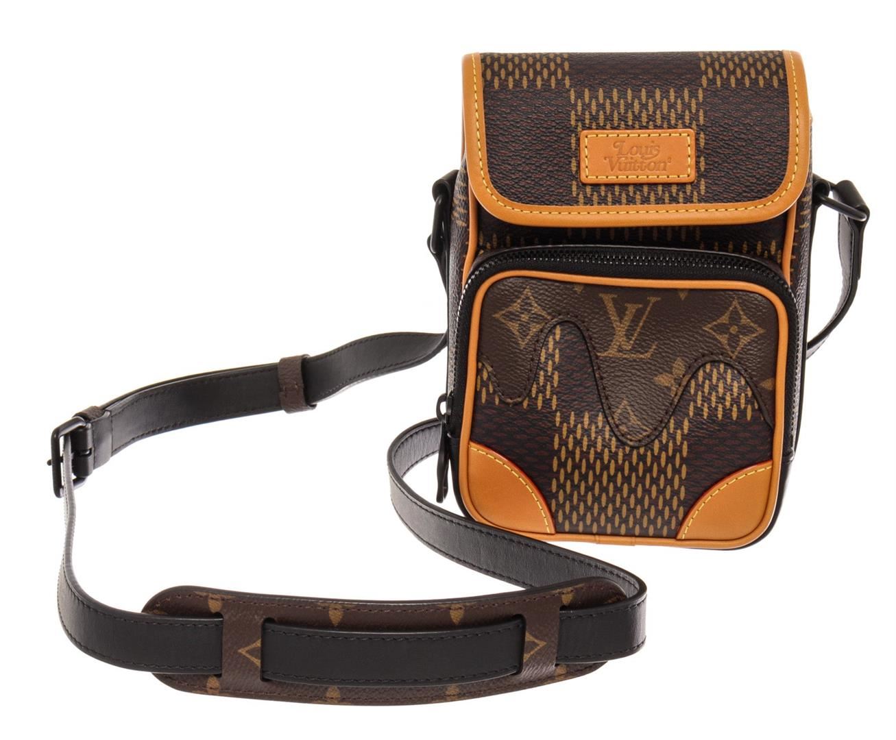 Louis Vuitton Brown Damier Giant Monogram Nigo Amazone Limited Edition Nano Messenger Bag. All available information is listed in the description and shown in the photos. Louis Vuitton Nigo Amazone Nano Messenger Bag features giant Damier Ebene coated canvas and drip brown Monogram coated canvas at the front pocket, brown textile lining, cowhide leather trim, matte-black hardware, adjustable shoulder strap and flap top over the open main compartment. Height 7", Width 5", Depth 3.5", Strap Drop 21-23"