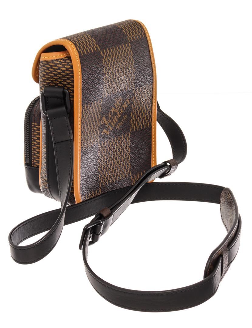 Louis Vuitton Brown Damier Giant Monogram Nigo Amazone Limited Edition Nano Messenger Bag. All available information is listed in the description and shown in the photos. Louis Vuitton Nigo Amazone Nano Messenger Bag features giant Damier Ebene coated canvas and drip brown Monogram coated canvas at the front pocket, brown textile lining, cowhide leather trim, matte-black hardware, adjustable shoulder strap and flap top over the open main compartment. Height 7", Width 5", Depth 3.5", Strap Drop 21-23"
