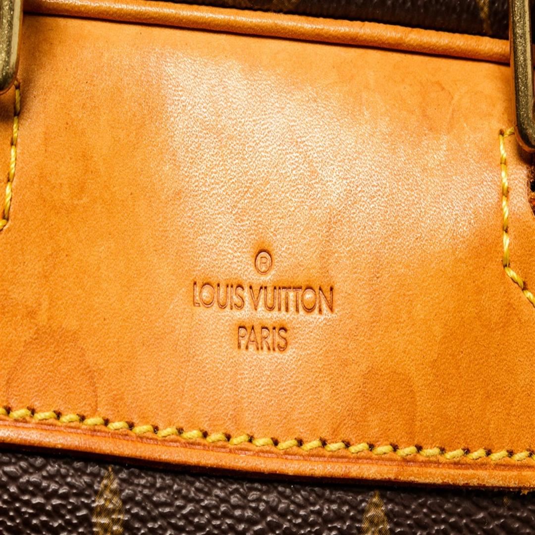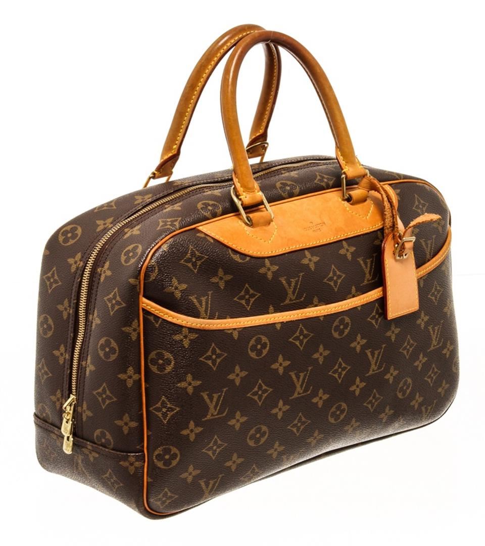One Louis Vuitton Brown Deauville Top Handle Bag. Item is sold AS-IS. All available information is listed in the description and shown in the photo. Louis Vuitton brown Deauville top handle bag features a monogram coated canvas exterior, beige suede lining, contrasting vachetta leather top handles, luggage tag, and trims, an exterior slip pocket, gold-tone hardware, a top zip closure, and interior open pockets. Height: 10.6" Width: 13.8" Depth: 5.5", Handle Drop: 5.75" / 26.92 x 35.05 x 13.97 Cm
