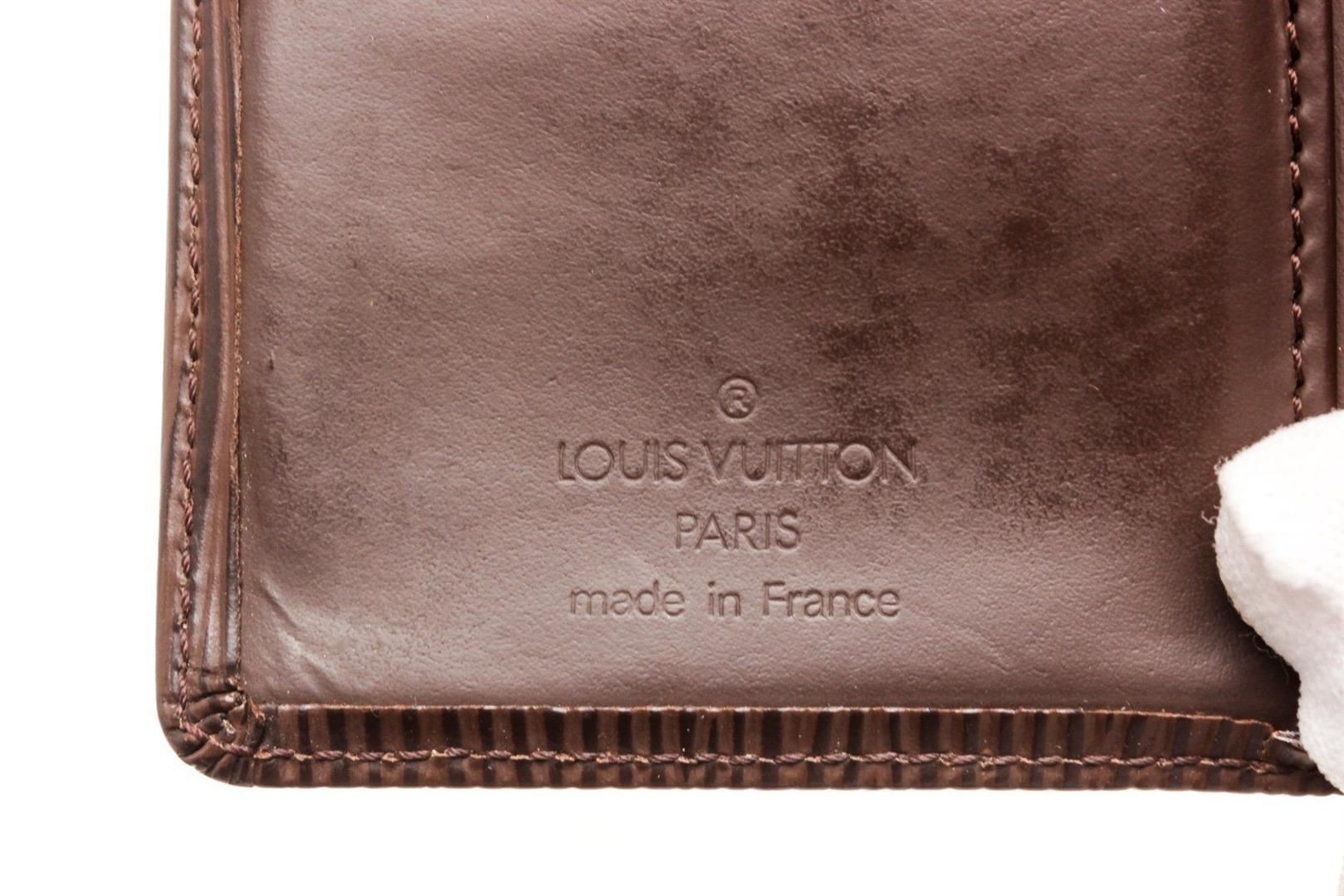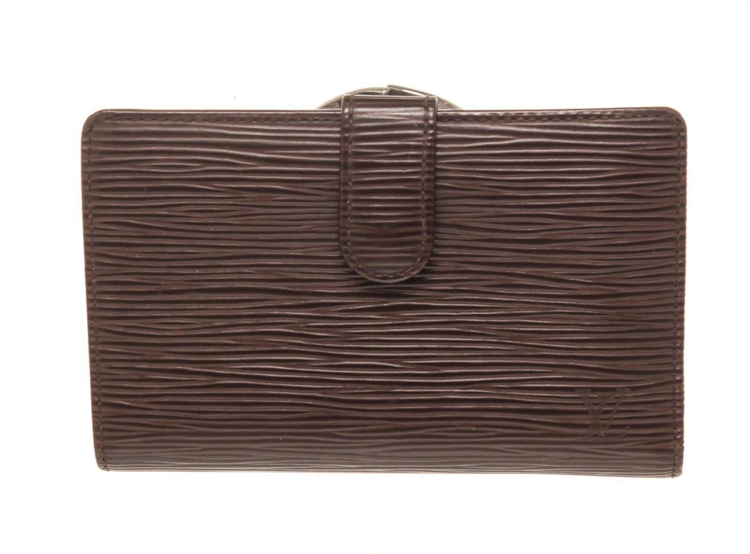 Louis Vuitton Brown Epi Leather French Walletwith gold-tone hardware, tan vachetta leather trim, single coin compartment with Kiss-lock closure, brown textured leather lining, dual slit compartments, four card slots, and snap closure at front.