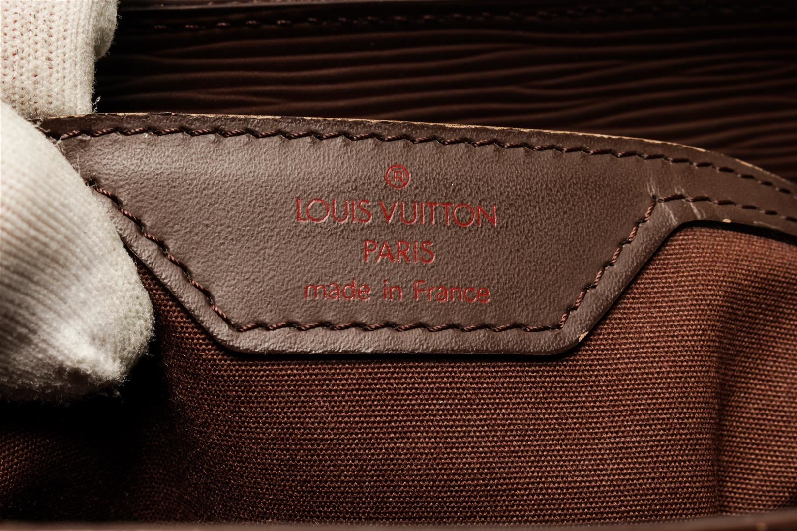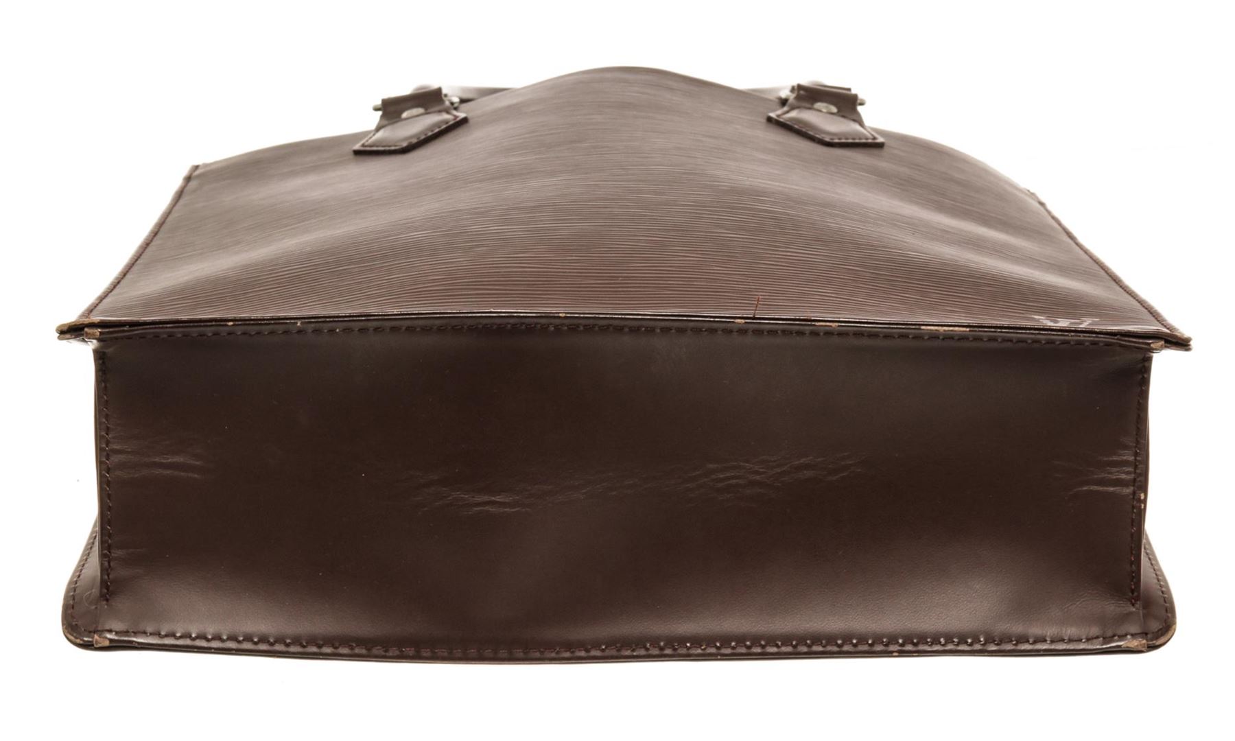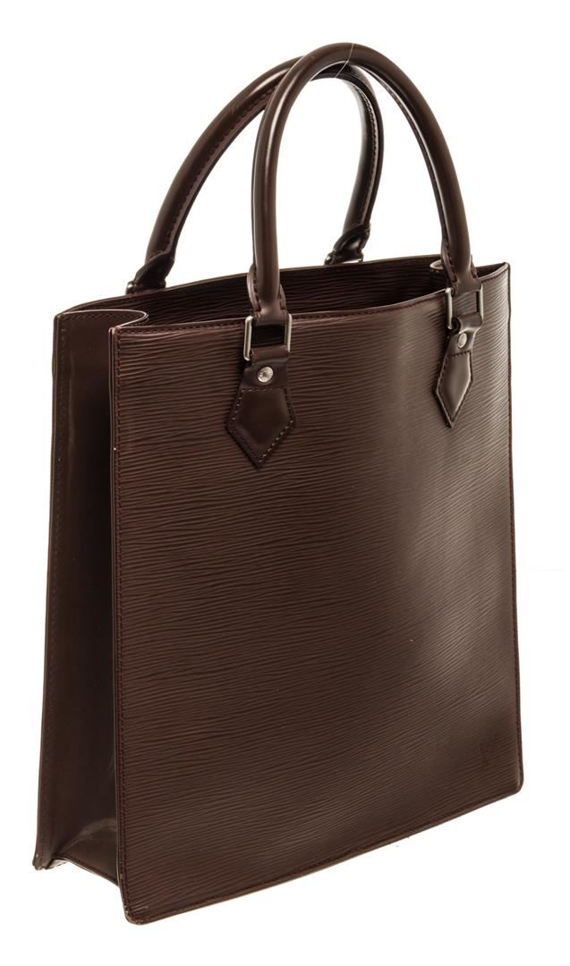 One Louis Vuitton Brown Epi Leather Sac Plat PM Tote Bag. Item is sold AS-IS. All available information is listed in the description and shown in the photo. Dark Brown epi leather Louis Vuitton Sac Plat with silver-tone hardware, dual tan rolled leather handles, dark brown canvas lining, dual interior slip pockets at interior wall and open top. .