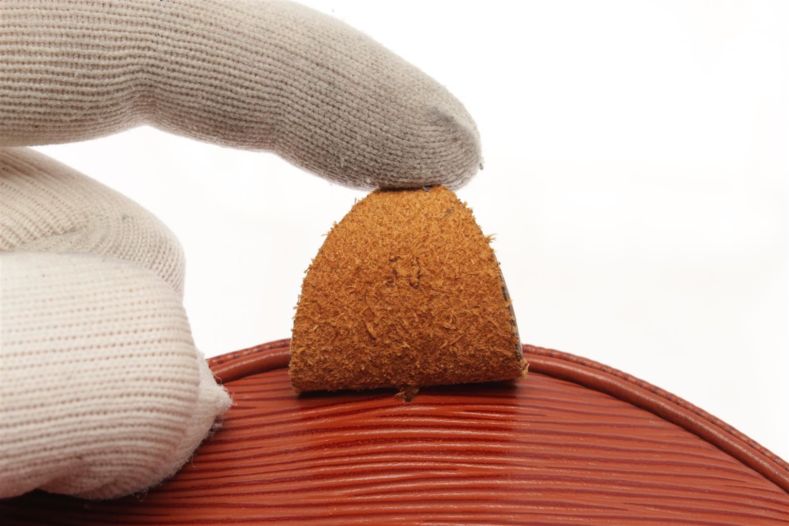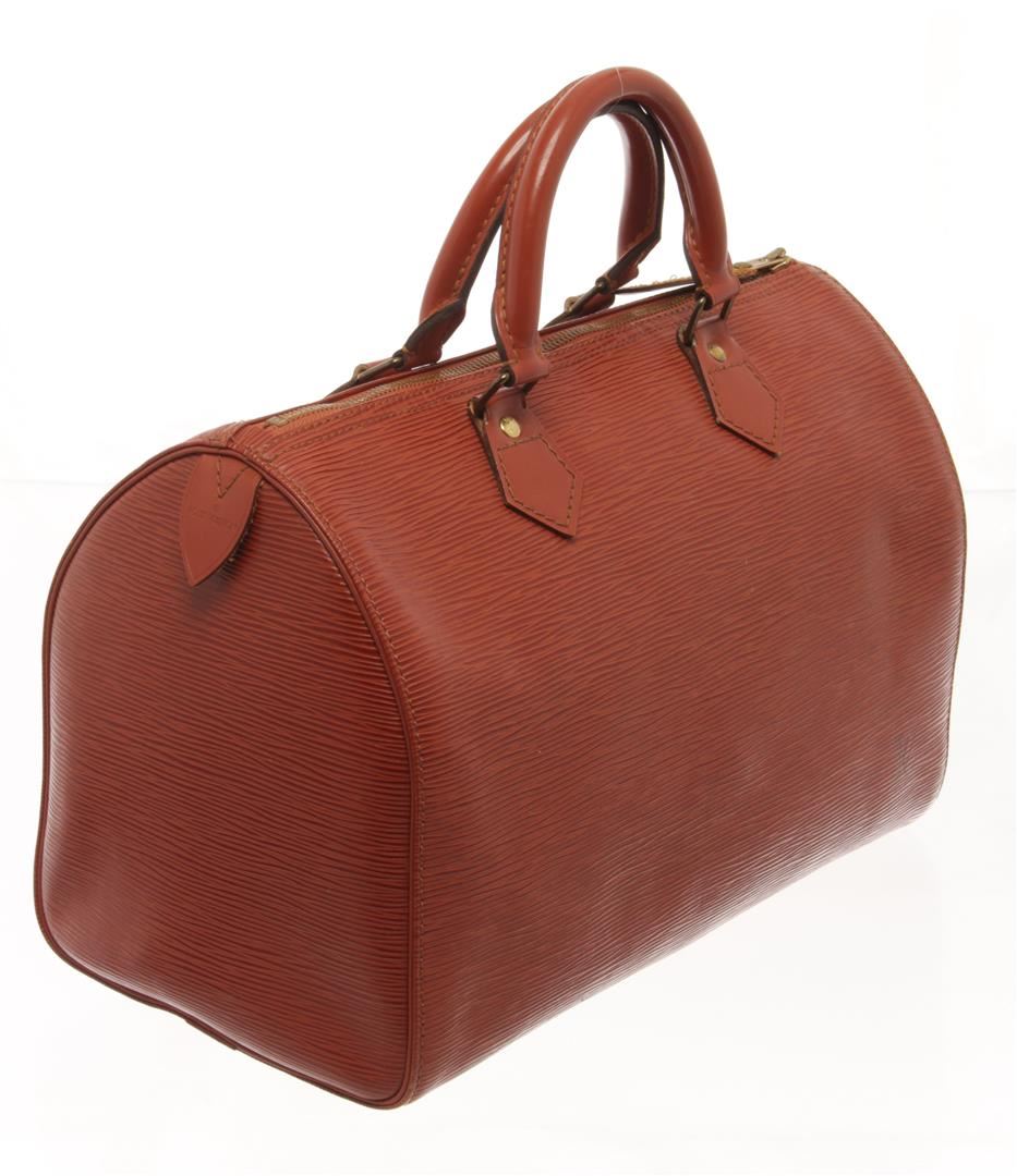 One Louis Vuitton Brown Epi Leather Speedy 30 Satchel Bag. Item is sold AS-IS. All available information is listed in the description and shown in the photo. louis vuitton brown epi leather speedy 30 satchel bag with gold-tone hardware, epi leather body, an exterior side slip pocket, rolled handles, a top zip closure, and an interior pocket. Depth 7.1 in, Handle 3.1 in, Height 8.7 in, Width 12.8 in/ Depth 18 cm, Handle 8 cm, Height 22 cm,, Width 32.5 cm