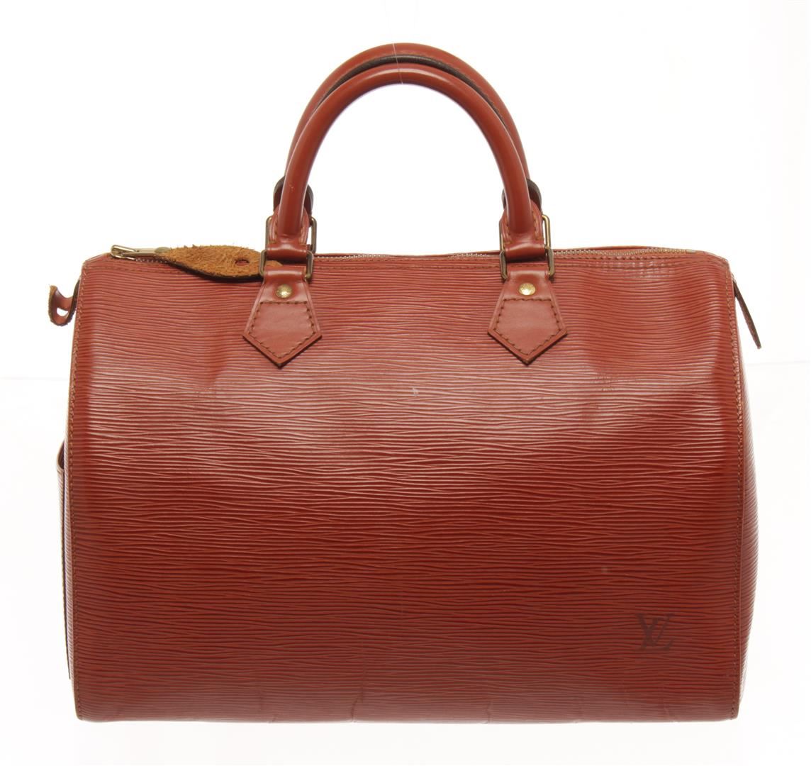 One Louis Vuitton Brown Epi Leather Speedy 30 Satchel Bag. Item is sold AS-IS. All available information is listed in the description and shown in the photo. louis vuitton brown epi leather speedy 30 satchel bag with gold-tone hardware, epi leather body, an exterior side slip pocket, rolled handles, a top zip closure, and an interior pocket. Depth 7.1 in, Handle 3.1 in, Height 8.7 in, Width 12.8 in/ Depth 18 cm, Handle 8 cm, Height 22 cm,, Width 32.5 cm