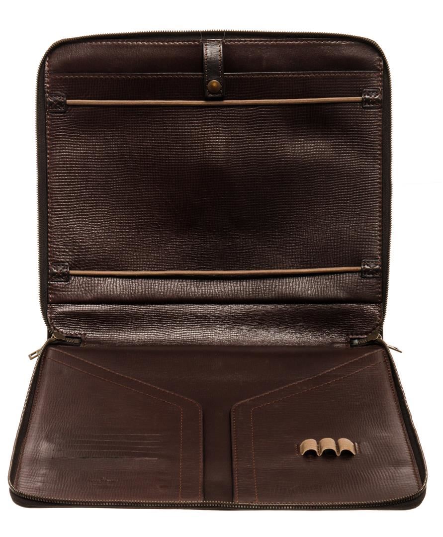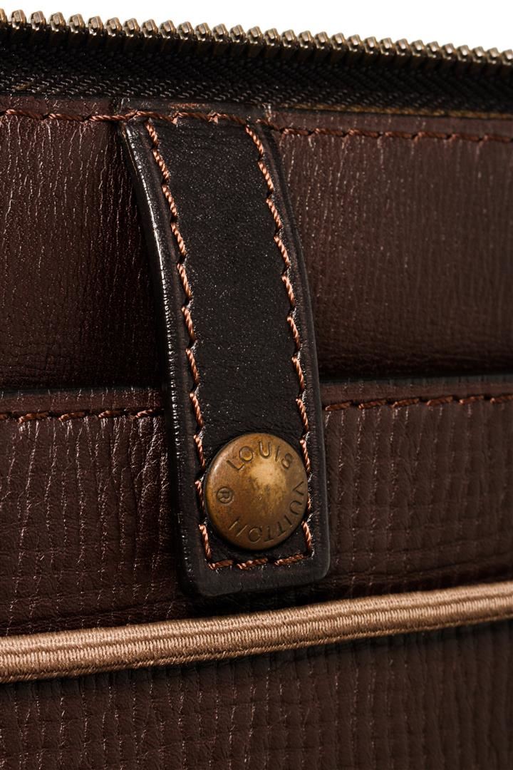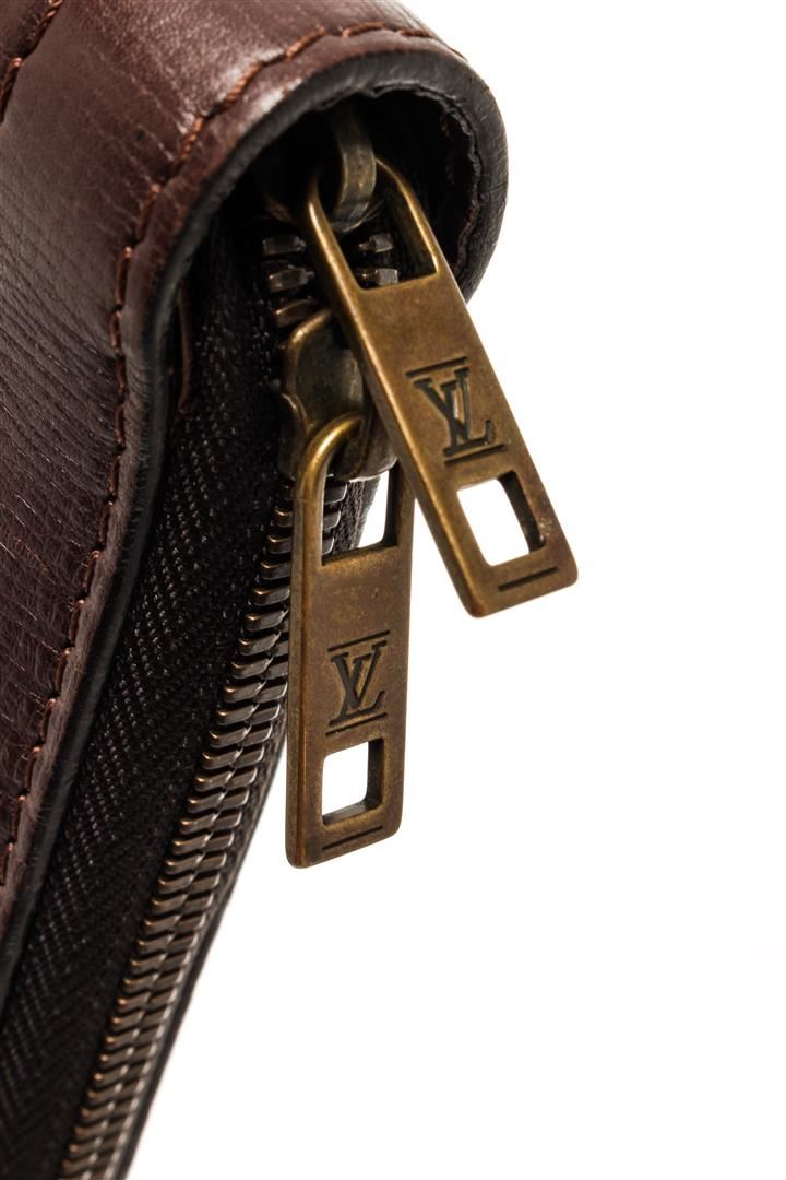One Louis Vuitton Brown Leather Bohemerun Clutch. Item is sold AS-IS. All available information is listed in the description and shown in the photo. Louis Vuitton Brown Leather Bohemerun Clutch features gold-tone hardware, Louis Vuitton Classic Boheme Run gold-tone plaque, brown taiga leather lining, dual interior slip pockets, brown leather top handle, and zip closure.