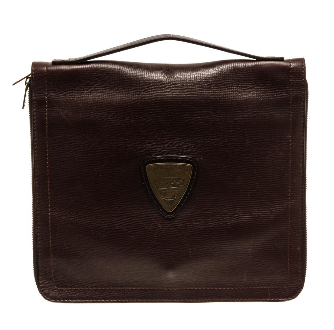 One Louis Vuitton Brown Leather Bohemerun Clutch. Item is sold AS-IS. All available information is listed in the description and shown in the photo. Louis Vuitton Brown Leather Bohemerun Clutch features gold-tone hardware, Louis Vuitton Classic Boheme Run gold-tone plaque, brown taiga leather lining, dual interior slip pockets, brown leather top handle, and zip closure.
