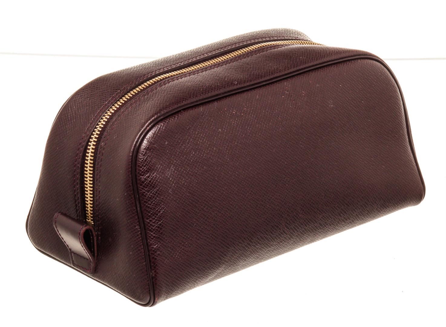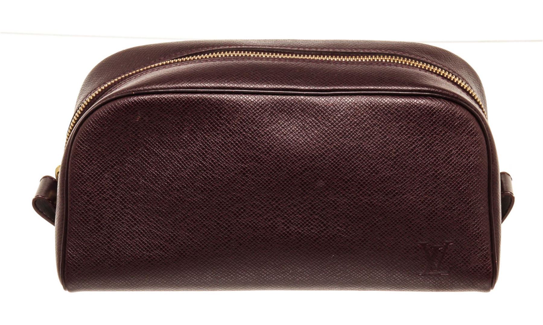 One Louis Vuitton Brown Leather Cosmetic Pouch Cosmetic Bag. Item is sold AS-IS. All available information is listed in the description and shown in the photo. Louis Vuitton Brown Leather Cosmetic Pouch Cosmetic Bag with leather, gold-tone hardware, trim tan vachetta leather, interior slip pocket, and zipper closure.