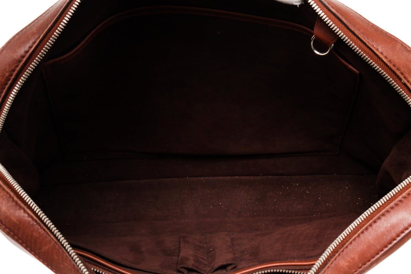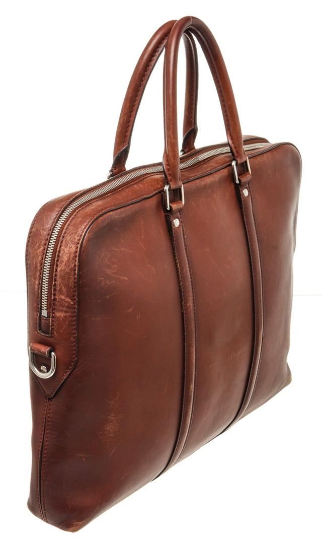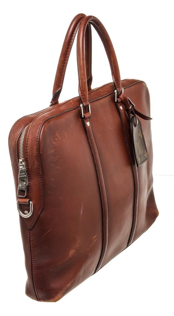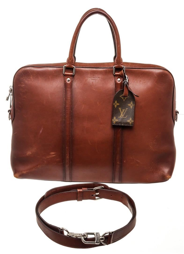 Louis Vuitton Brown Leather Porte Documents Voyage Briefcase Bag with gold-tone hardware, black leather trim, dual rolled top handles, black canvas lining, single interior compartment featuring two pen slots and seven pockets; one featuring zip closure and two-way zip closure at top.