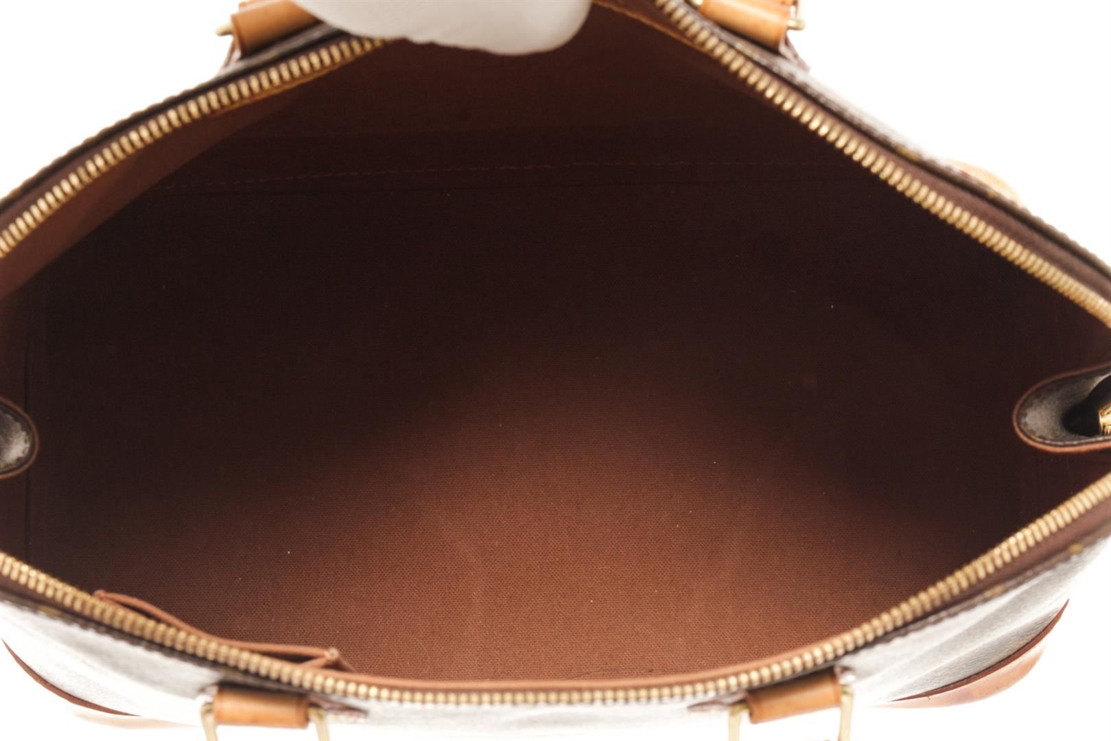 One Louis Vuitton Brown Monogram Alma Bag. Item is sold AS-IS. All available information is listed in the description and shown in the photo. Louis Vuitton Brown Monogram Alma PM Bag with top handle, canvas lining, interior slip pockets, gold tone hardware, zipper closure. There is heavy wear on the bottom of the bag. Please refer to photos. Height: 9.1" Width: 13.4" Depth: 6.1", Handle Drop: / 23.11 x 34.03 x 15.49 Cm