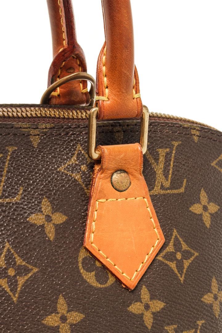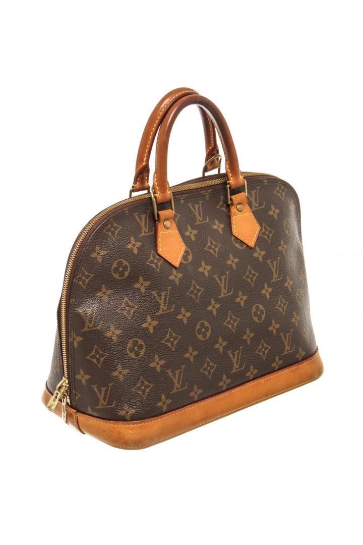 One Louis Vuitton Brown Monogram Alma PM Bag. Item is sold AS-IS. All available information is listed in the description and shown in the photo. Louis Vuitton Brown Monogram Alma PM Bag with top handle, canvas lining, interior slip pockets, gold tone hardware, zipper closure. Height: 8.9" Width: 12.6" Depth: 5.9", Handle Drop: 3.1" / 22.60 x 32 x 14.98 Cm