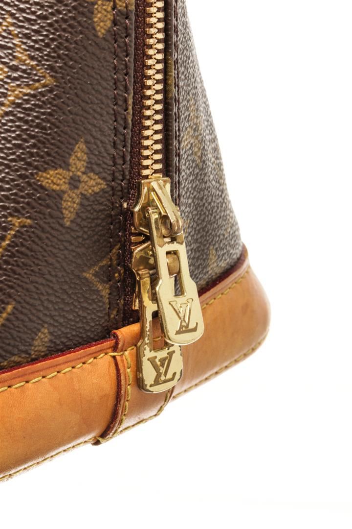 One Louis Vuitton Brown Monogram Alma PM Bag. Item is sold AS-IS. All available information is listed in the description and shown in the photo. Louis Vuitton Brown Monogram Alma PM Bag with top handle, canvas lining, interior slip pockets, gold tone hardware, zipper closure. Height: 8.9" Width: 12.6" Depth: 5.9", Handle Drop: 3.1" / 22.60 x 32 x 14.98 Cm