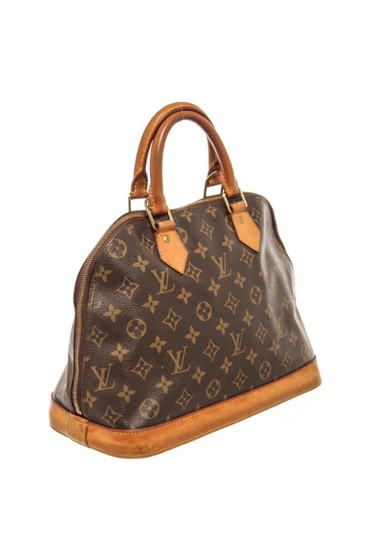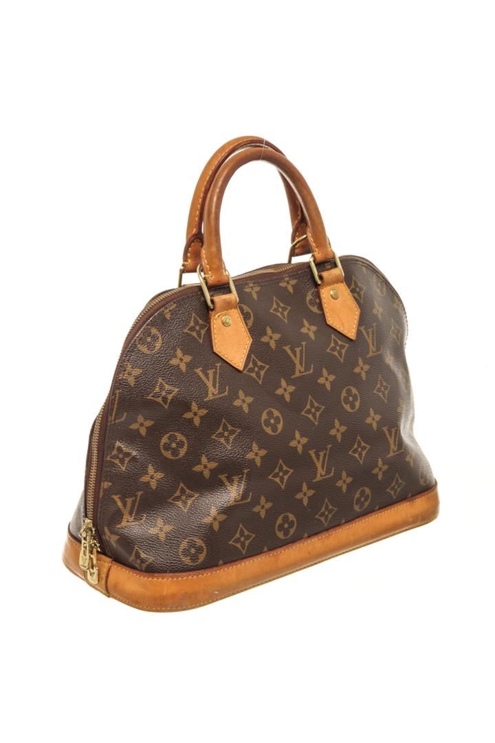 One Louis Vuitton Brown Monogram Alma PM Bag. Item is sold AS-IS. All available information is listed in the description and shown in the photo. Louis Vuitton Brown Monogram Alma PM Bag with top handle, canvas lining, interior slip pockets, gold tone hardware, zipper closure. There is some wear on the bottom of the bag and handles. Please refer to photos. Height: 9.1" Width: 14.2" Depth: 6.1", Handle Drop: 3.1" / 23.11 x 36.06 x 15.49 Cm