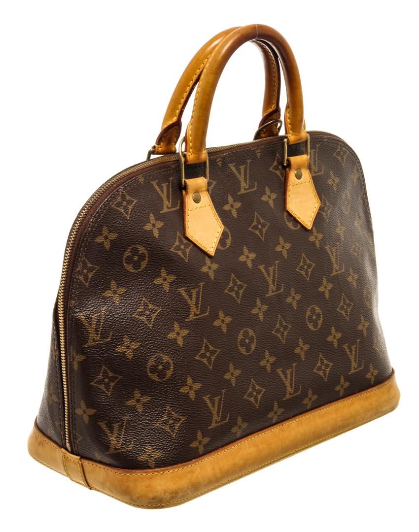 One Louis Vuitton Brown Monogram Alma PM Handbag. Item is sold AS-IS. All available information is listed in the description and shown in the photo. Louis Vuitton Brown Monogram Alma PM Handbag with gold tone hardware, leather trim, rolled handles, leather trim embellishment, canvas lining & single interior pocket, zip closure at top Height: 9.5" Width: 12" Depth: 6.5" Handle Drop: 3.25" / 24.1 x 30.4 x 16.5 Cm