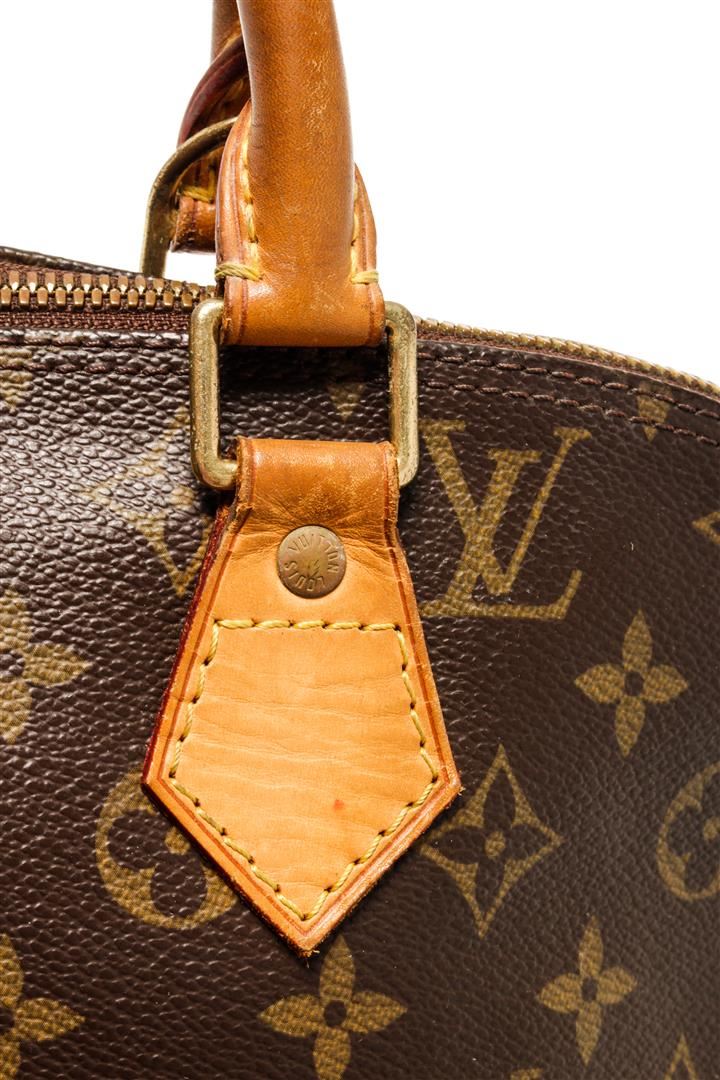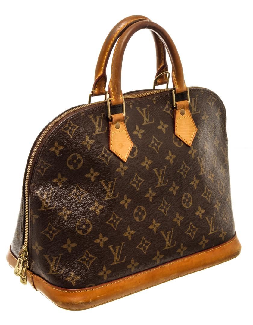 One Louis Vuitton Brown Monogram Alma PM Handbag. Item is sold AS-IS. All available information is listed in the description and shown in the photo. Louis Vuitton Brown Monogram Alma PM Handbag with gold tone hardware, leather trim, top handle, leather trim embellishment, canvas lining & single interior pocket, zip closure. Height: 9.5" Width: 12" Depth: 6.5" Handle Drop: 3.25" / 24.1 x 30.4 x 16.5 Cm