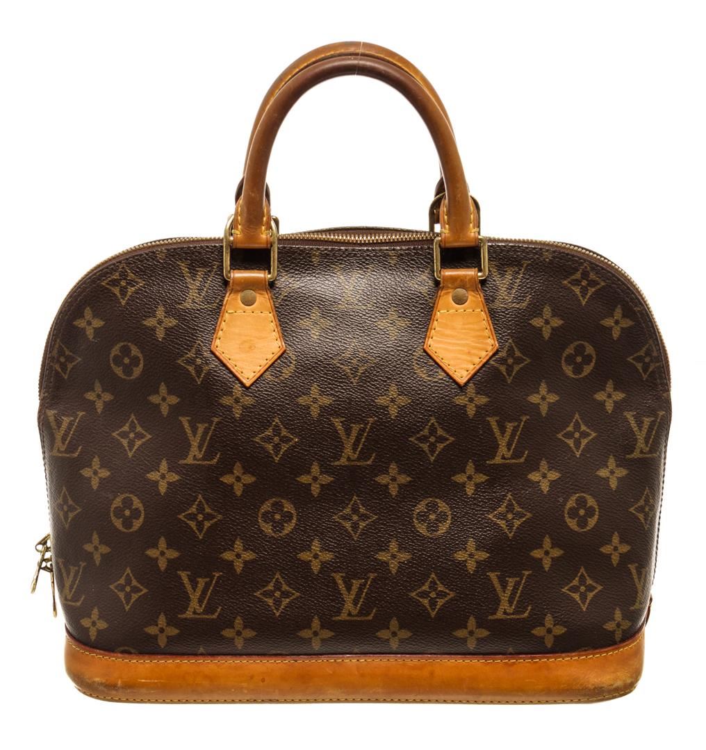 One Louis Vuitton Brown Monogram Alma PM Handbag. Item is sold AS-IS. All available information is listed in the description and shown in the photo. Louis Vuitton Brown Monogram Alma PM Handbag with gold tone hardware, leather trim, top handle, leather trim embellishment, canvas lining & single interior pocket, zip closure. Height: 9.5" Width: 12" Depth: 6.5" Handle Drop: 3.25" / 24.1 x 30.4 x 16.5 Cm