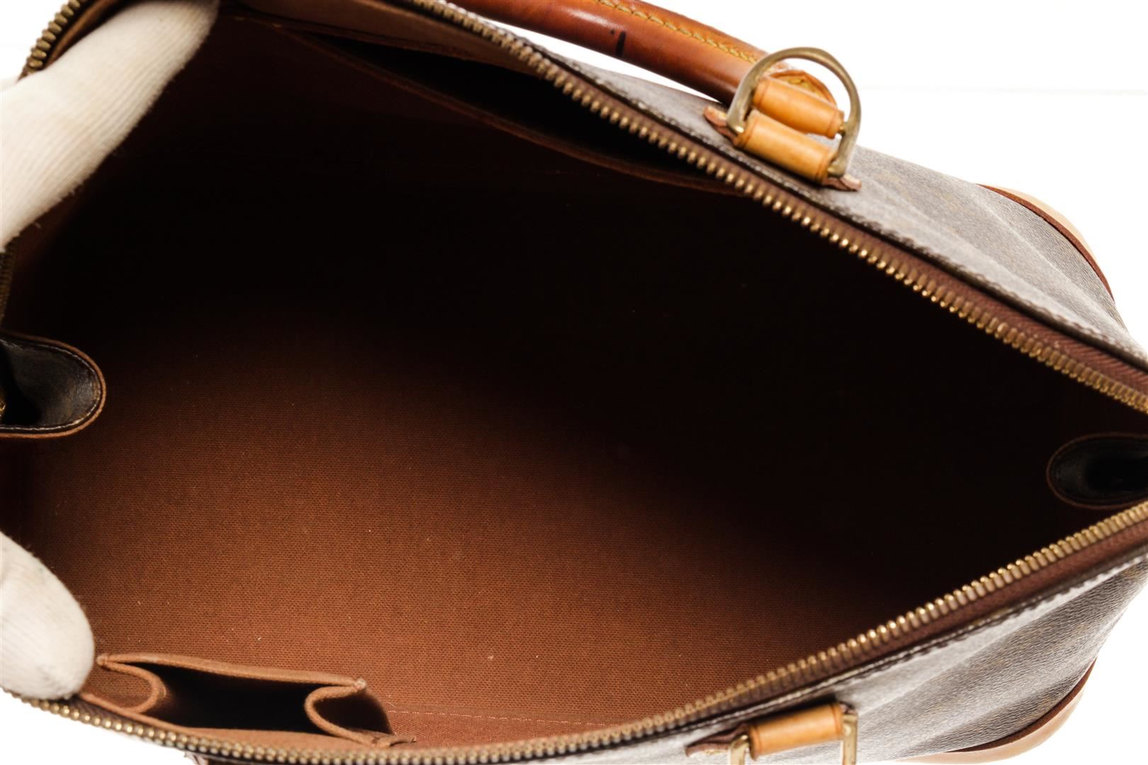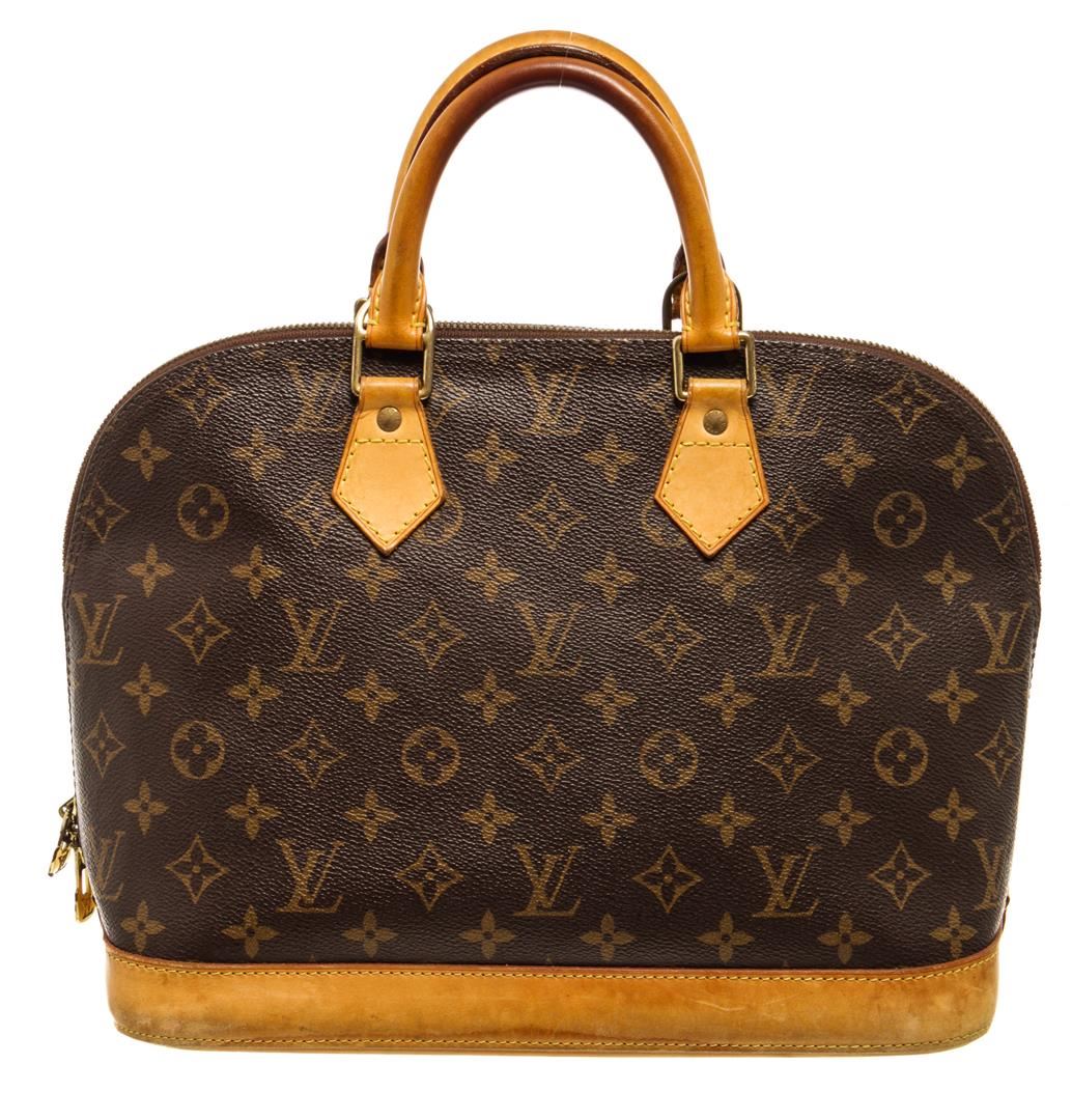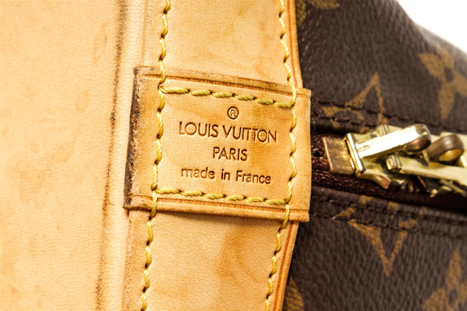 One Louis Vuitton Brown Monogram Alma PM Handbag. Item is sold AS-IS. All available information is listed in the description and shown in the photo. Louis Vuitton Brown Monogram Alma PM Handbag with gold tone hardware, leather trim, rolled handles, leather trim embellishment, canvas lining & single interior pocket, zip closure at top Height: 9.5" Width: 12" Depth: 6.5" Handle Drop: 3.25" / 24.1 x 30.4 x 16.5 Cm