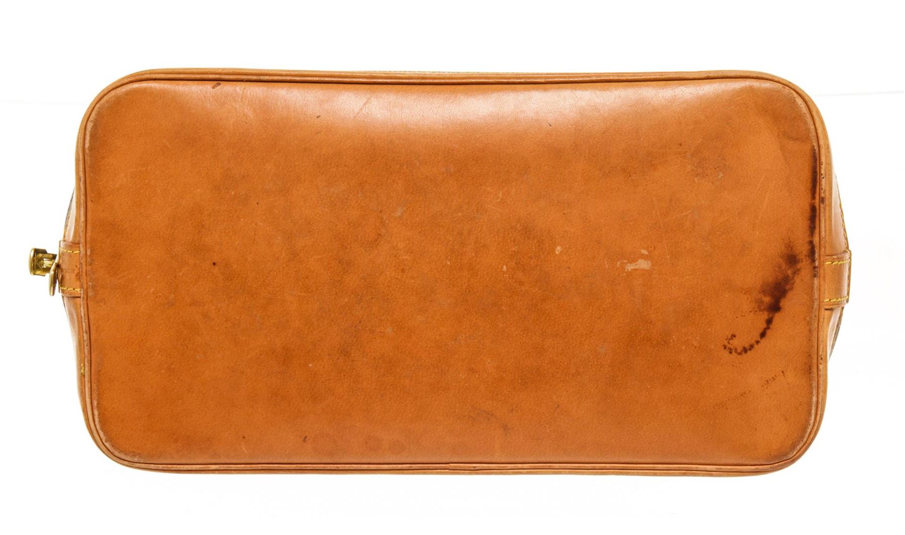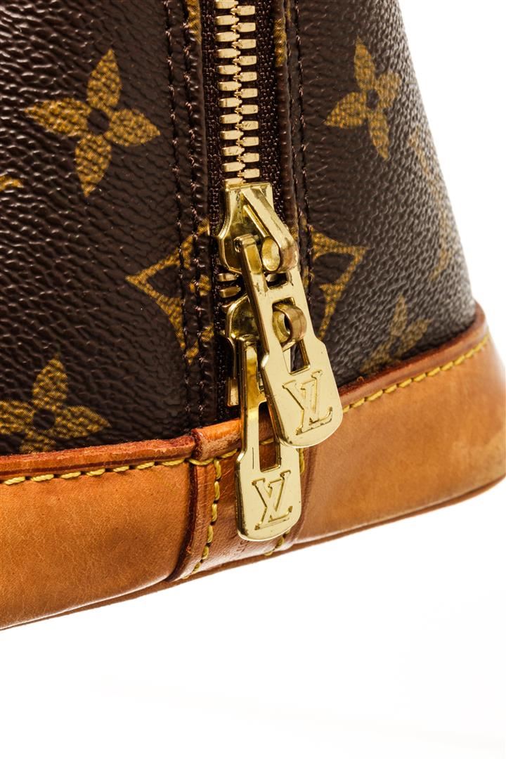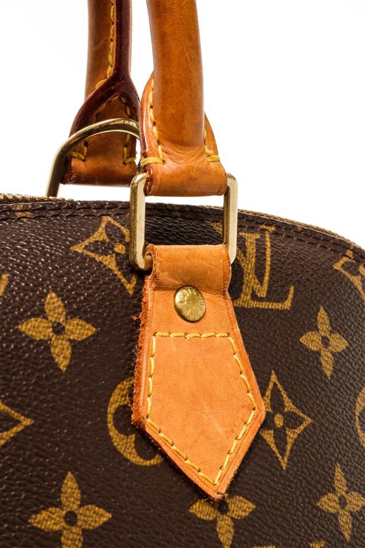 One Louis Vuitton Brown Monogram Canvas Alma GM Satchel Bag. Item is sold AS-IS. All available information is listed in the description and shown in the photo. louis vuitton brown monogram canvas alma gm satchel bag with the alma pm a monogram canvas body, rolled leather handles, a leather bottom, a top zip closure, and an interior slip pocket. Depth 6.7 in, Handle 3.1 in, Height 9.4 in, Width 12.2 in / Depth 17 cm, Handle 8 cm, Height 24 cm, Width 31 cm