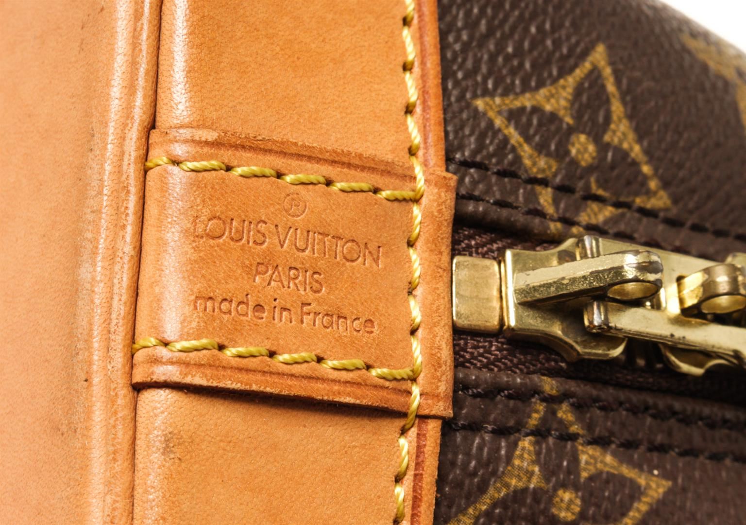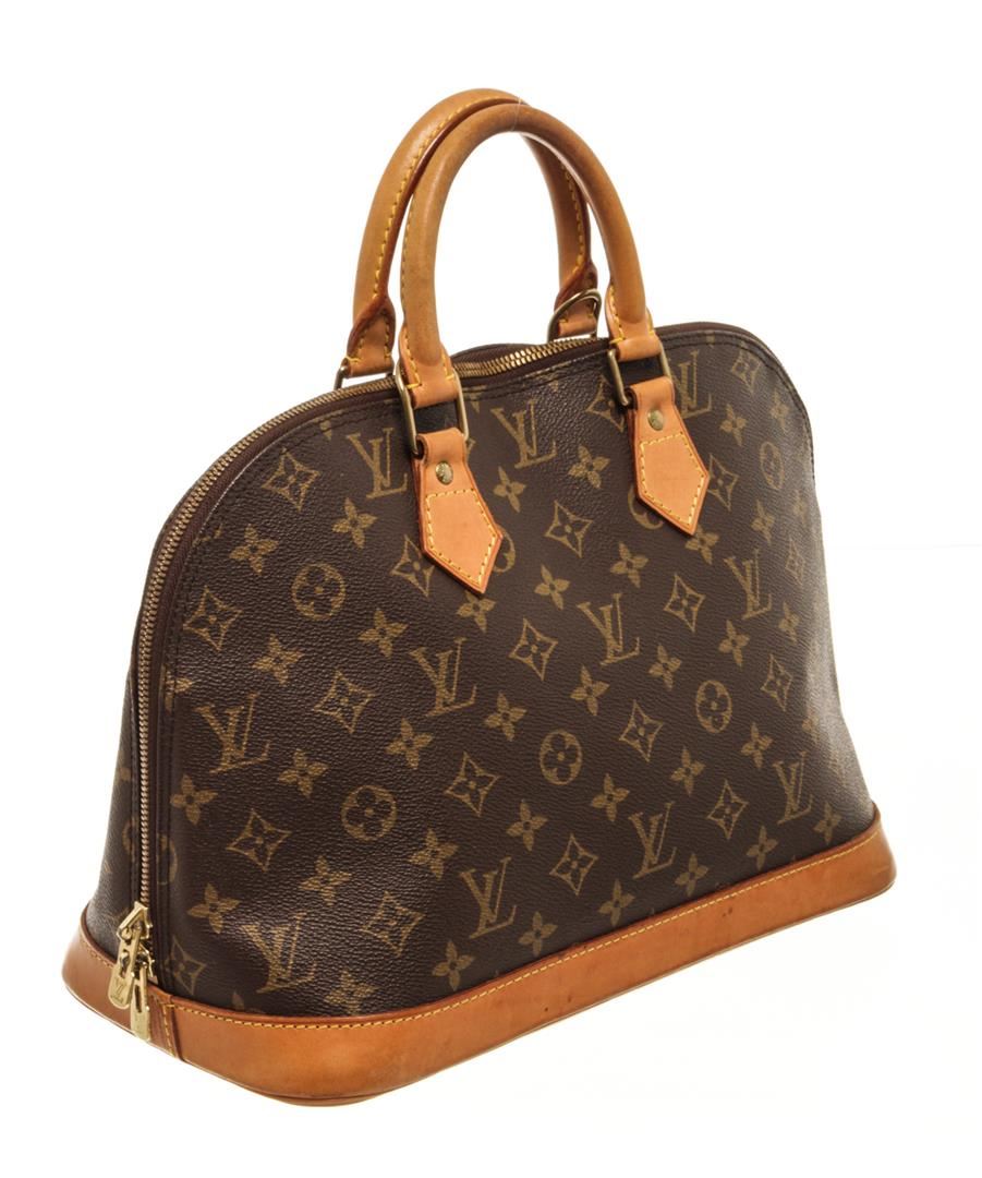 One Louis Vuitton Brown Monogram Canvas Alma PM Handbag. Item is sold AS-IS. All available information is listed in the description and shown in the photo. Louis Vuitton Brown Monogram Canvas Alma PM Handbag with the alma pm features a monogram canvas body, rolled leather handles, a leather bottom, a top zip closure, and an interior slip pocket. There is a huge brown stain on bottom of bag as shown in photos. 9.05" x 11.41" x 6.10" Inches / Length: 23.00cm x Width: 29.00cm x Depth: 15.50cm.