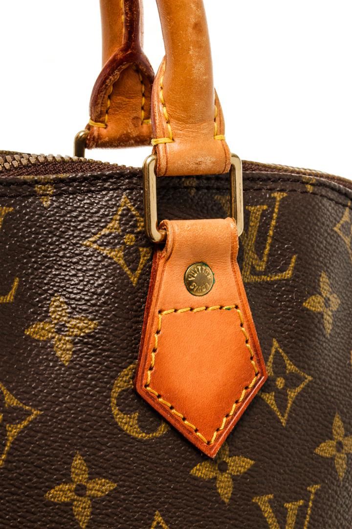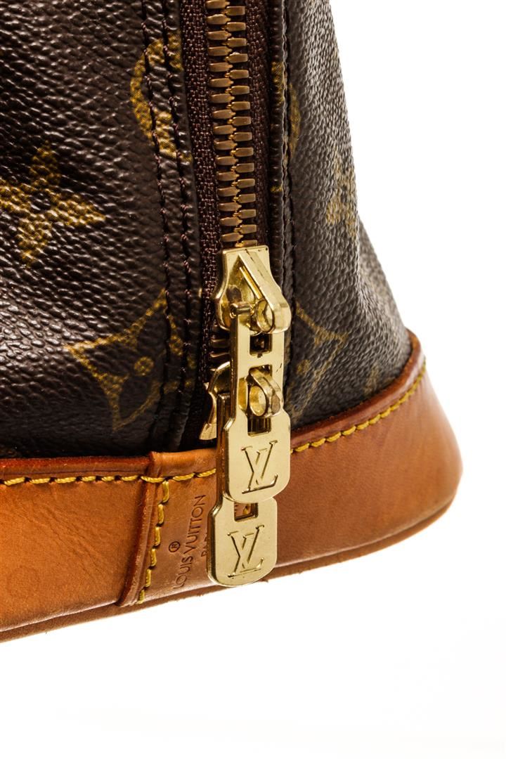 One Louis Vuitton Brown Monogram Canvas Alma PM Satchel Bag. Item is sold AS-IS. All available information is listed in the description and shown in the photo. brown louis vuitton monogram alma pm bag with the alma pm features a monogram canvas body, rolled leather handles, a leather bottom, a top zip closure, and an interior slip pocket. 8.9" L x 11.4" W x 5.9" D / 22.60 x 28.95 x 14.98 CM