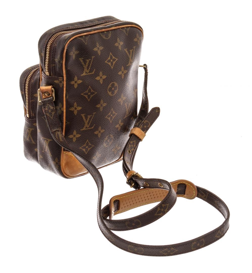 Louis Vuitton Brown Monogram Canvas Amazone Crossbody Bag. All available information is listed in the description and shown in the photos. Louis Vuitton Brown Monogram Canvas Amazone Crossbody Bag with tan vachetta leather trim, brass hardware, adjustable shoulder strap, exterior zip pocket, interior slip pocket and top zip closure. Height: 22.86 cm (9 in), Width: 15.24 cm (6 in), Depth: 8.89 cm (3.5 in)