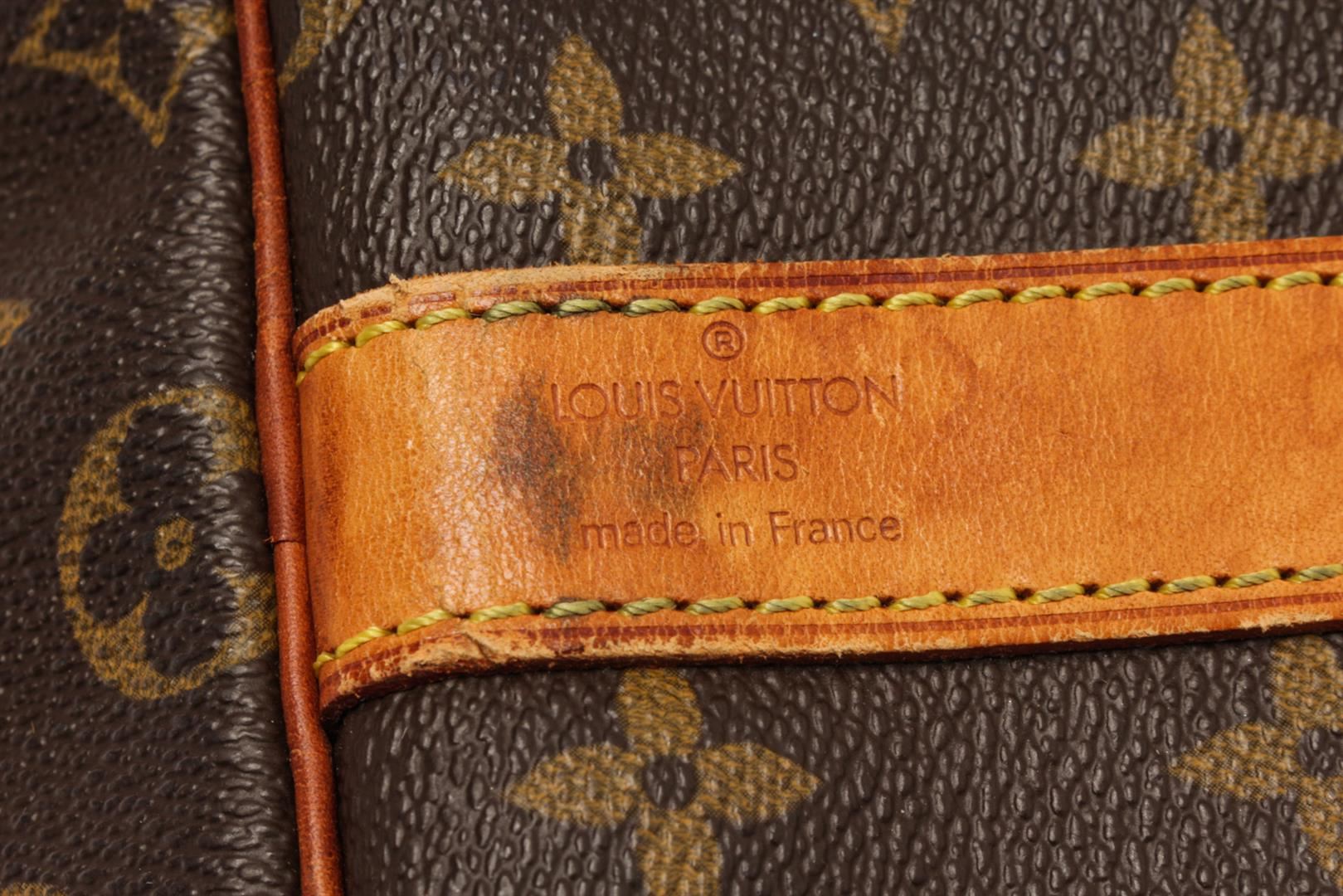 Louis Vuitton Brown Monogram Canvas Bandoulière Keepall 55 Travel Bag. All available information is listed in the description and shown in the photos. Louis Vuitton brown monogram coated canvas Keepall Bandoulière 55 travel bag with gold-tone hardware, brown fabric interior, contrasting vachetta leather top handles and trims, and a top zipper closure. Height: 12.2" Width: 9.4" Depth: 21.7, 30.99 x 23.88 x 55.12 Cm