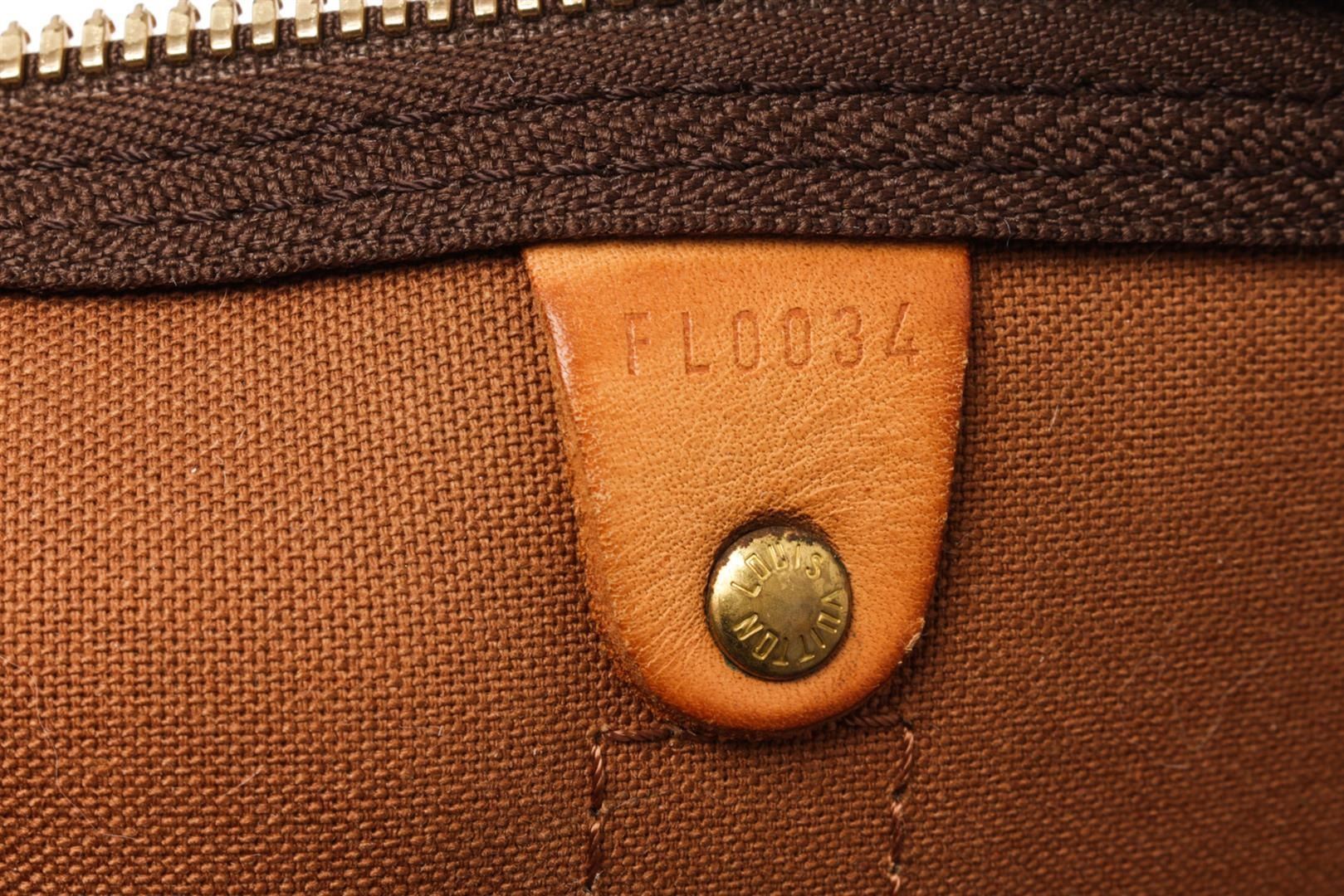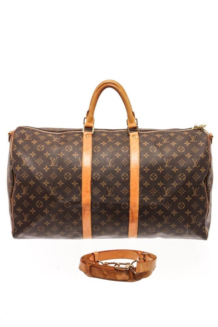 Louis Vuitton Brown Monogram Canvas Bandoulière Keepall 55 Travel Bag. All available information is listed in the description and shown in the photos. Louis Vuitton brown monogram coated canvas Keepall Bandoulière 55 travel bag with gold-tone hardware, brown fabric interior, contrasting vachetta leather top handles and trims, and a top zipper closure. Height: 12.2" Width: 9.4" Depth: 21.7, 30.99 x 23.88 x 55.12 Cm