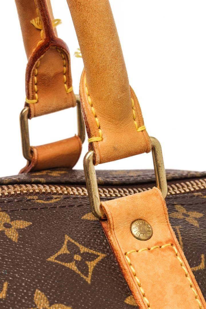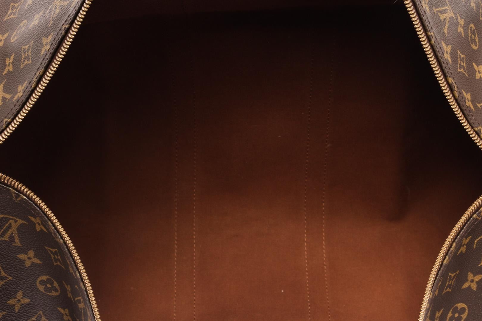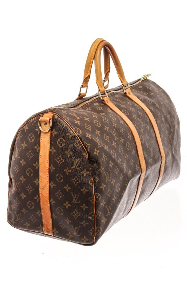 Louis Vuitton Brown Monogram Canvas Bandoulière Keepall 55 Travel Bag. All available information is listed in the description and shown in the photos. Louis Vuitton brown monogram coated canvas Keepall Bandoulière 55 travel bag with gold-tone hardware, brown fabric interior, contrasting vachetta leather top handles and trims, and a top zipper closure. Height: 12.2" Width: 9.4" Depth: 21.7, 30.99 x 23.88 x 55.12 Cm