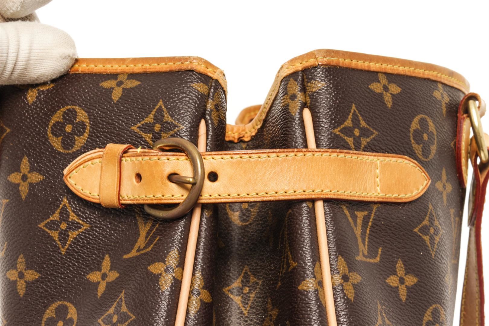 One Louis Vuitton Brown Monogram Canvas Batignolles Horizontal Shoulder Bag. Item is sold AS-IS. All available information is listed in the description and shown in the photo. Louis Vuitton Brown Monogram Canvas Batignolles Horizontal Shoulder Bag with shoulder strap, canvas lining, interior pocket, gold tone hardware, interior pocket. There is some wear on the gold hardware connected to the strap, a tear on the inside leather loop. Please refer to photos. Depth 5.5 in, Handle 9.8 in, Height 11.8 in, Width 12.6 in / Depth 14 cm, Handle 25 cm, Height 30 cm, Width 32 cm