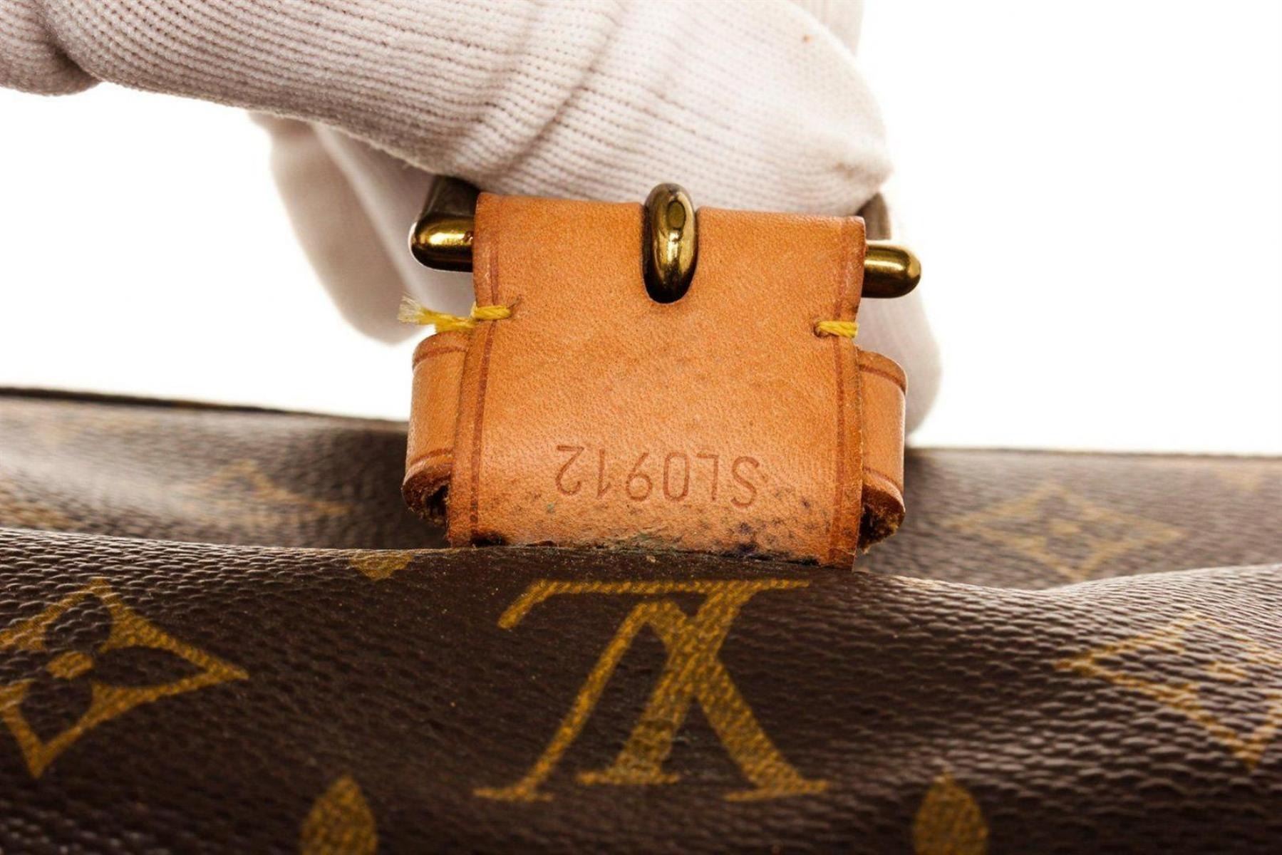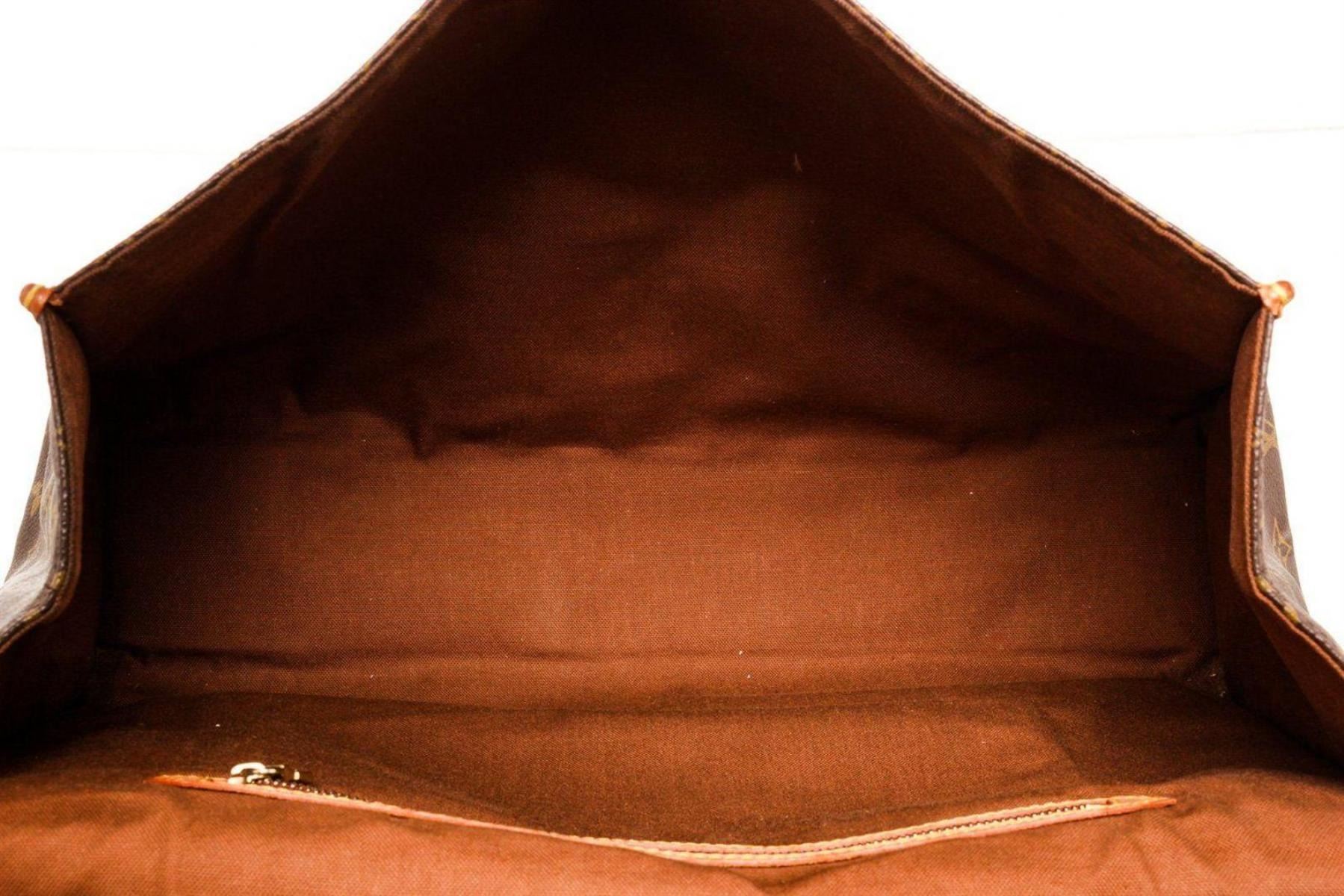 Louis Vuitton Brown Monogram Canvas Beverly Briedcase Bag with monogram canvas, brass hardware, tan vachetta leather trim, single flat top handle, brown canvas lining, single pocket at interior wall with zip closure and flap with buckle closure at front.