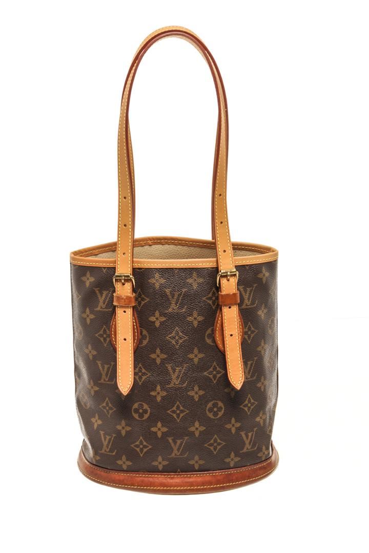 One Louis Vuitton Brown Monogram Canvas Bucket PM Shoulder Bag. Item is sold AS-IS. All available information is listed in the description and shown in the photo. Louis Vuitton Brown Monogram Canvas Bucket PM Shoulder Bag with shoulder strap, leather lining, interior pocket, gold tone hardware. Bottom is worn, top lining and handle is replaced, markings in leather lining. Please refer to photos.