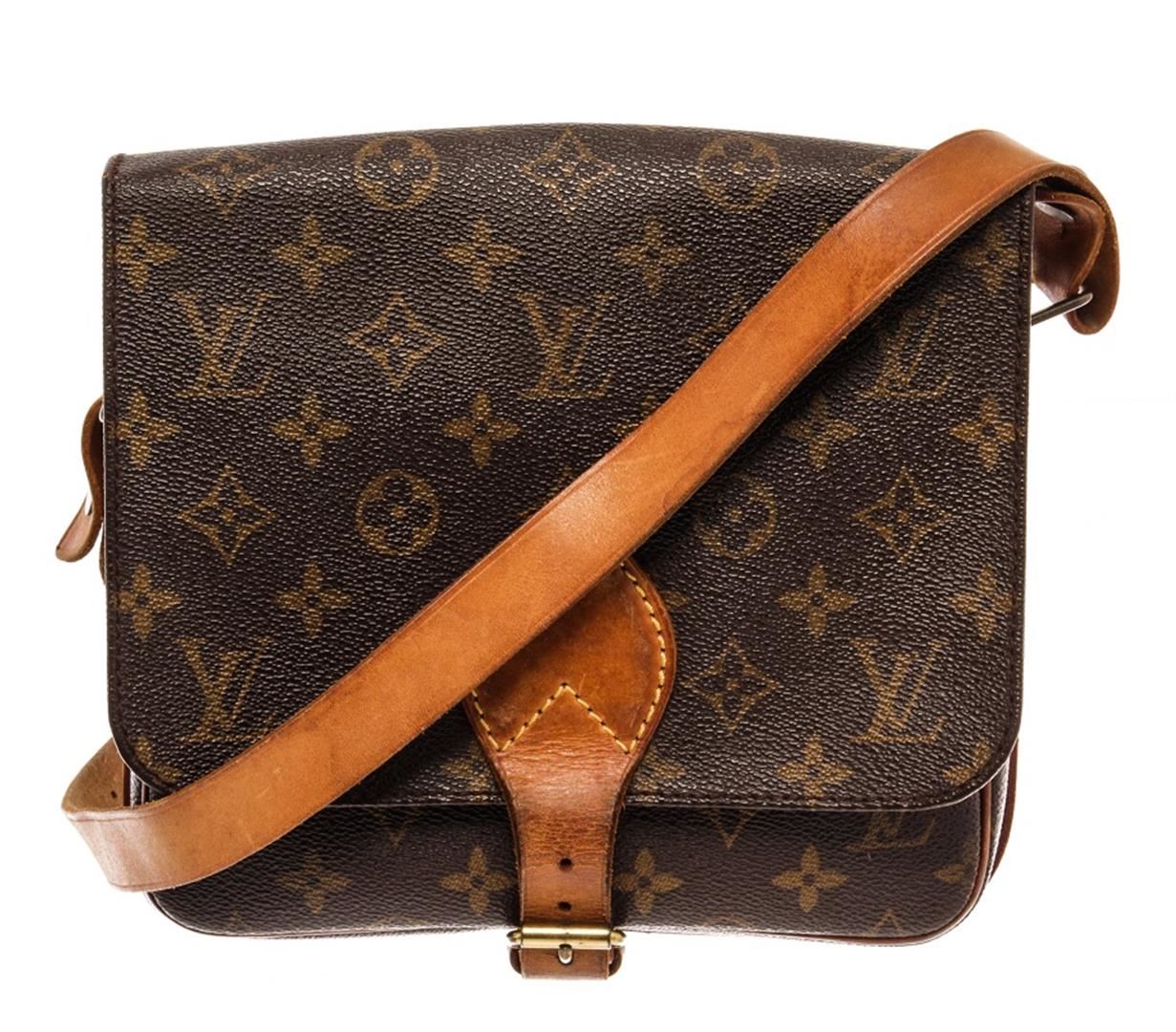 Louis Vuitton Brown Monogram Canvas Cartouchiere MM Messenger Bag. All available information is listed in the description and shown in the photos. Louis Vuitton Brown Monogram Canvas Cartouchiere MM Messenger Bag with brown coated canvas, brass hardware, leather trim, single adjustable shoulder strap, leather trim embellishment, leather lining, buckle closure at front. Height: 7.75" Width: 8" Depth: 3", Shoulder Strap Drop: 19.75" / 19.68 x 20.32 x 7.62 Cm