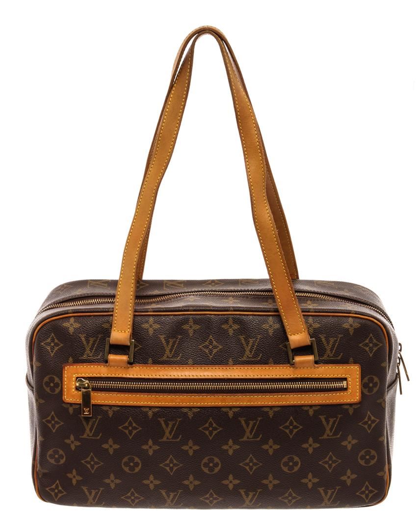 Louis Vuitton Brown Monogram Canvas Cite GM Shoulder Bag. All available information is listed in the description and shown in the photos. Louis Vuitton Brown Monogram Canvas Cite GM Shoulder Bag with brown coated canvas, brass hardware, dual shoulder straps, single exterior pocket, alcantara lining & dual interior pockets, zip closure at top. Height: 8.75" Width: 13.5" Depth: 3.75", Shoulder Strap Drop: 10.5" / 22.22 x 34.29 x 9.52 Cm