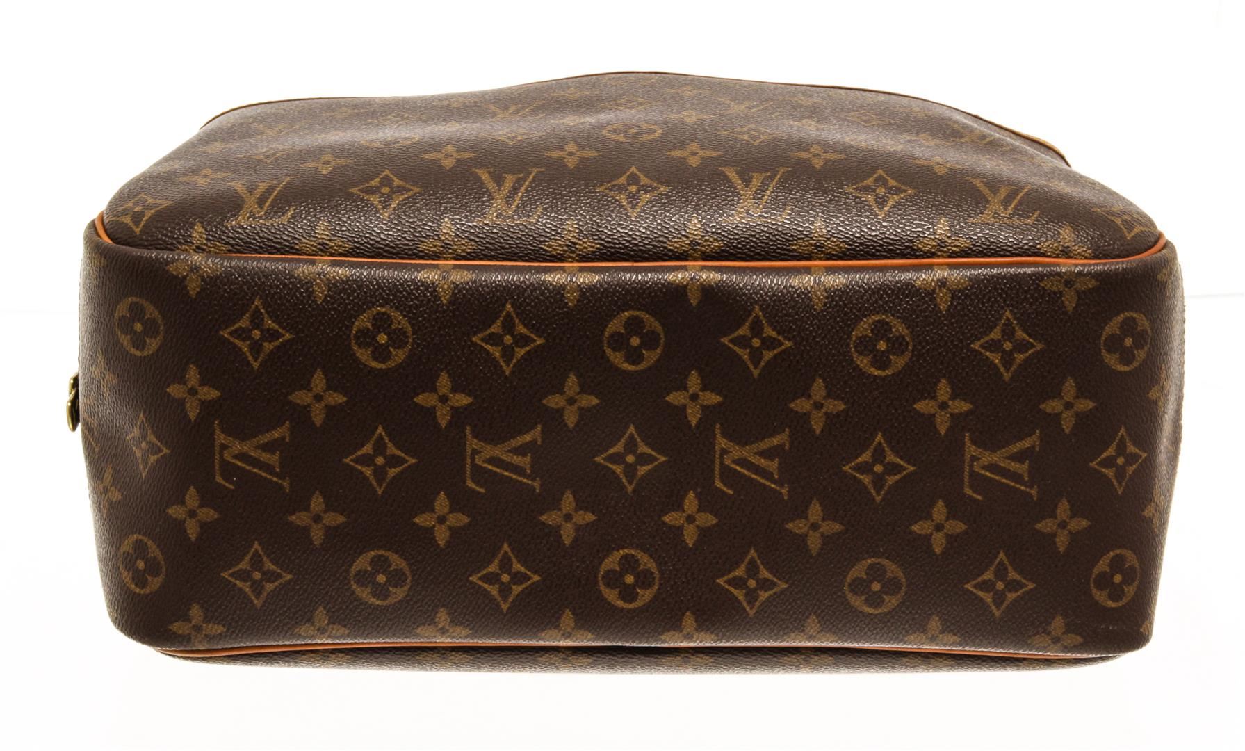 One Louis Vuitton Brown Monogram Canvas Deauville Satchel Bag. Item is sold AS-IS. All available information is listed in the description and shown in the photo. monogram deauville handbag from louis vuitton gold-tone hardware, monogram canvas, leather tag, debossed logo, two-way zip fastening, two rounded top handles, front patch pocket, internal patch pockets, internal logo patch. Depth 5.9 in, Handle 4.3 in, Height 11.4 in, Width 13.8 in / Depth 15 cm, Handle 11 cm, Height 29 cm, Width 35 cm